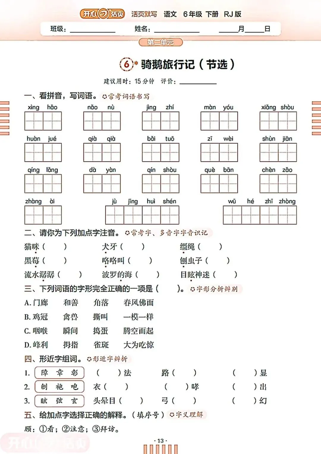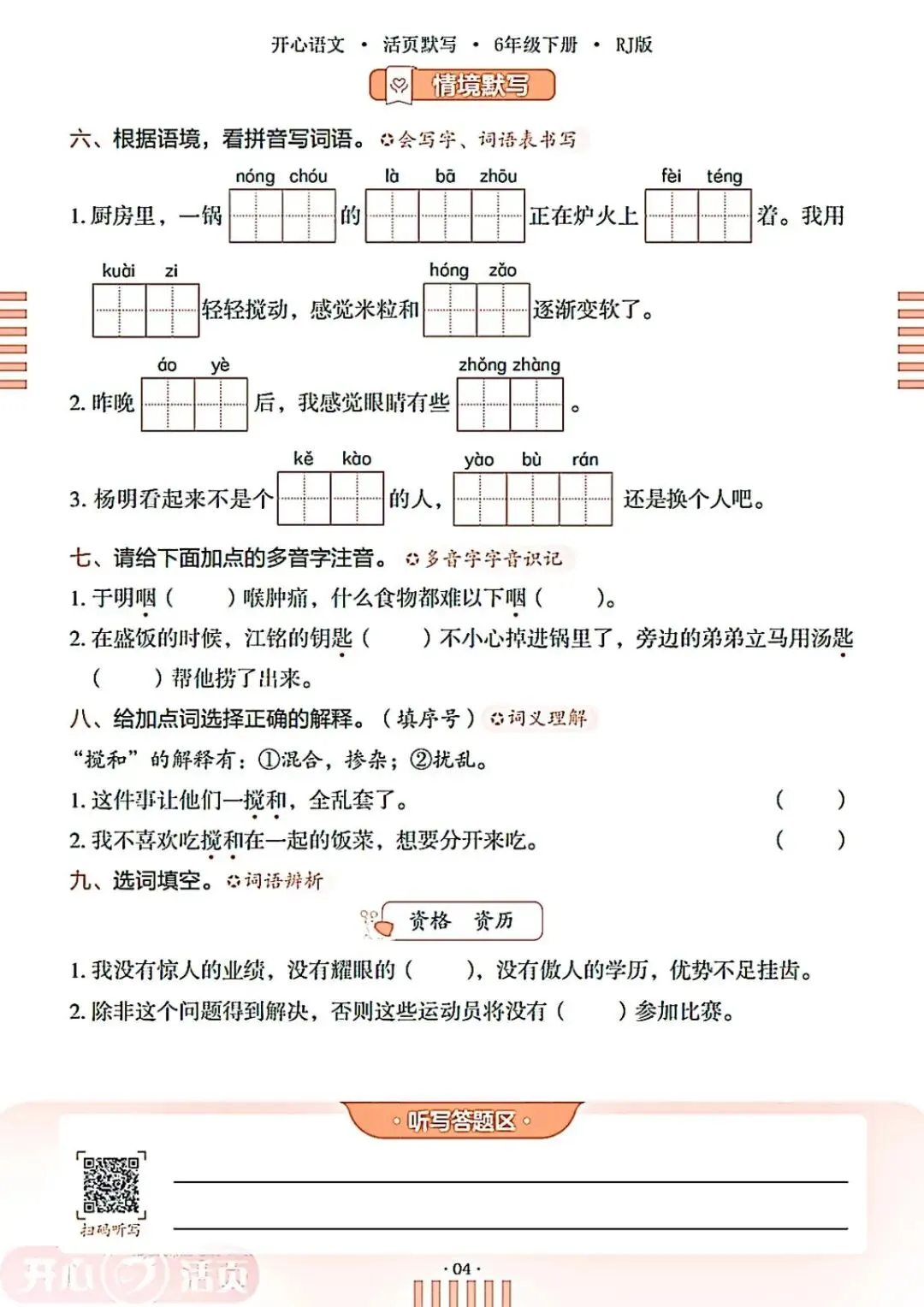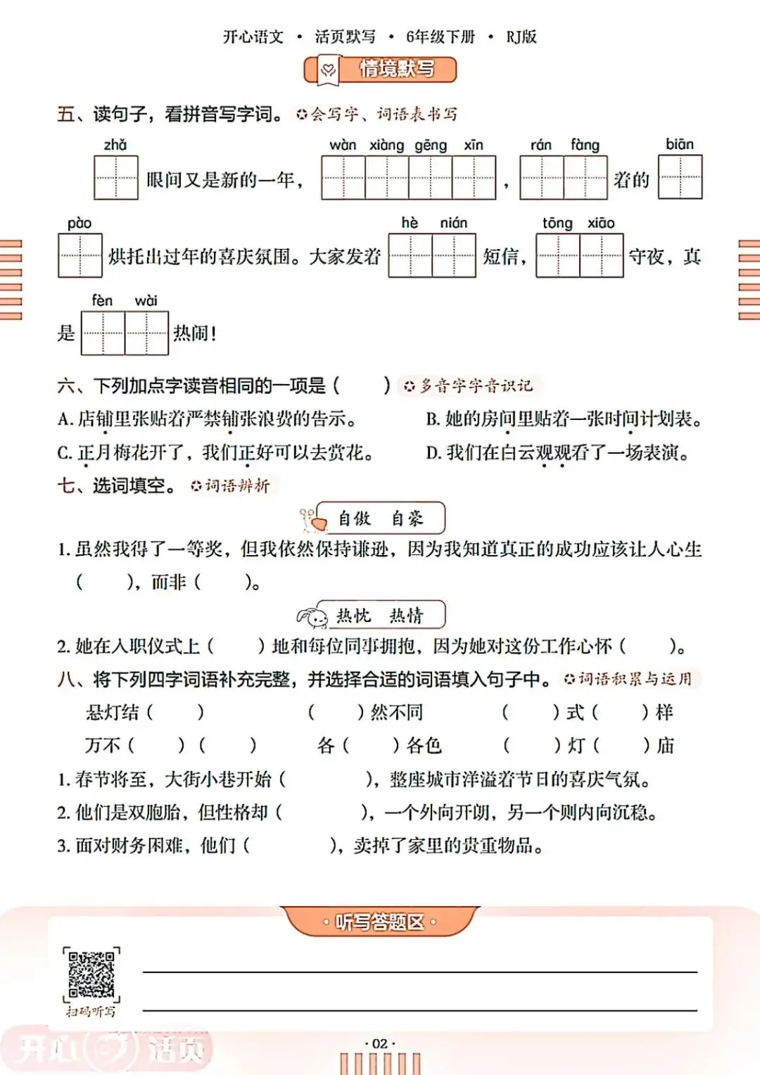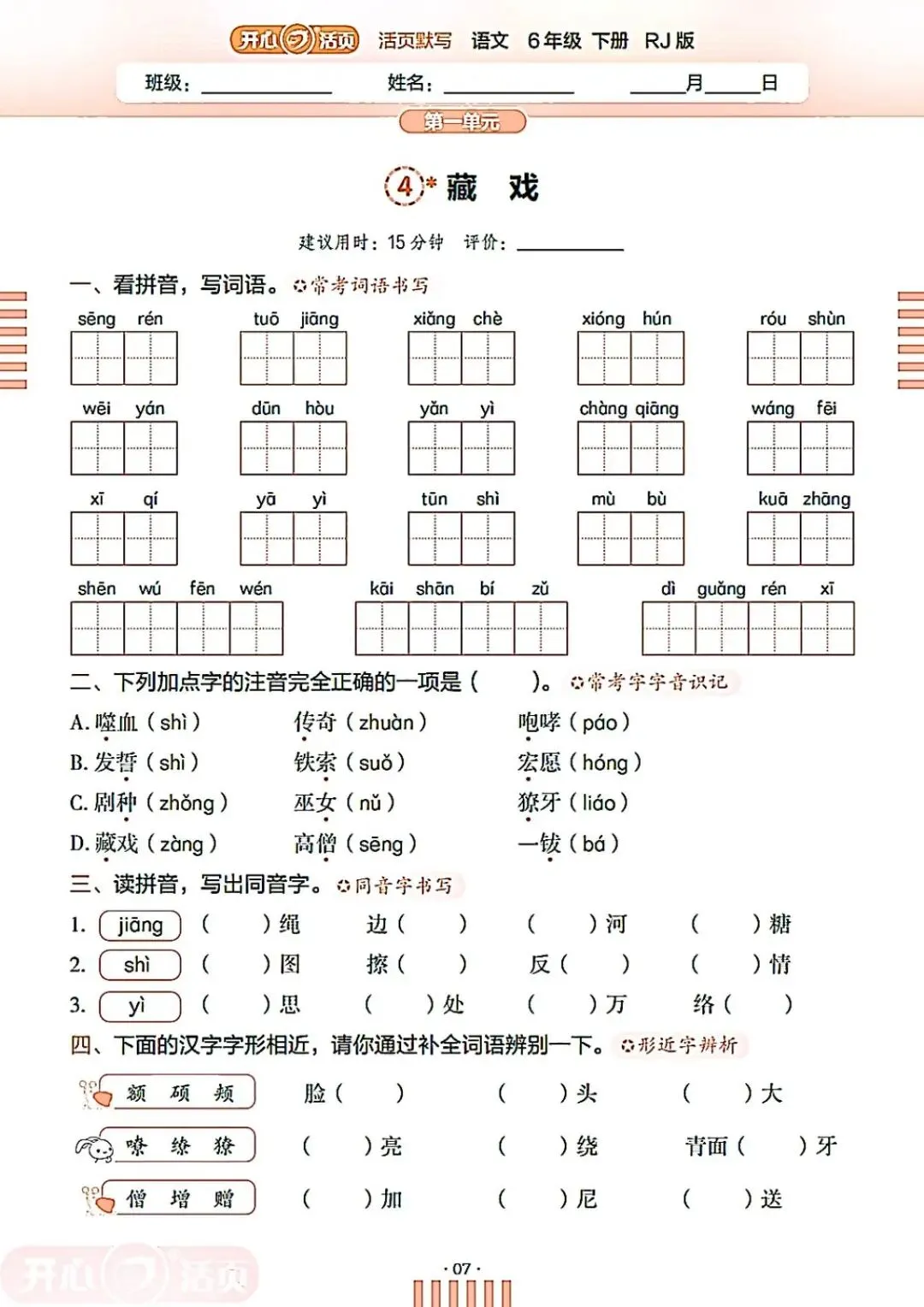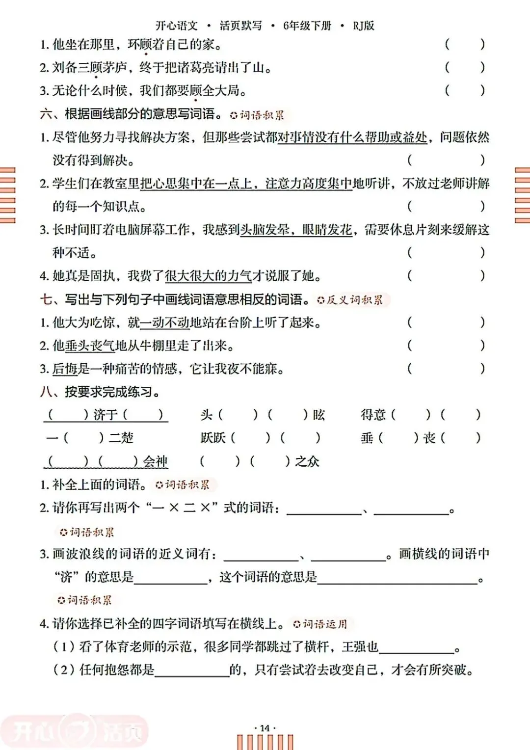 6年级下册语文《开心活页默写》(领高清PDF打印版)