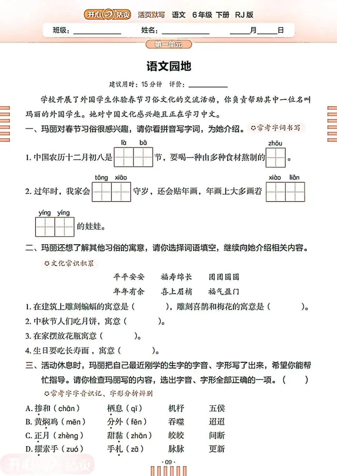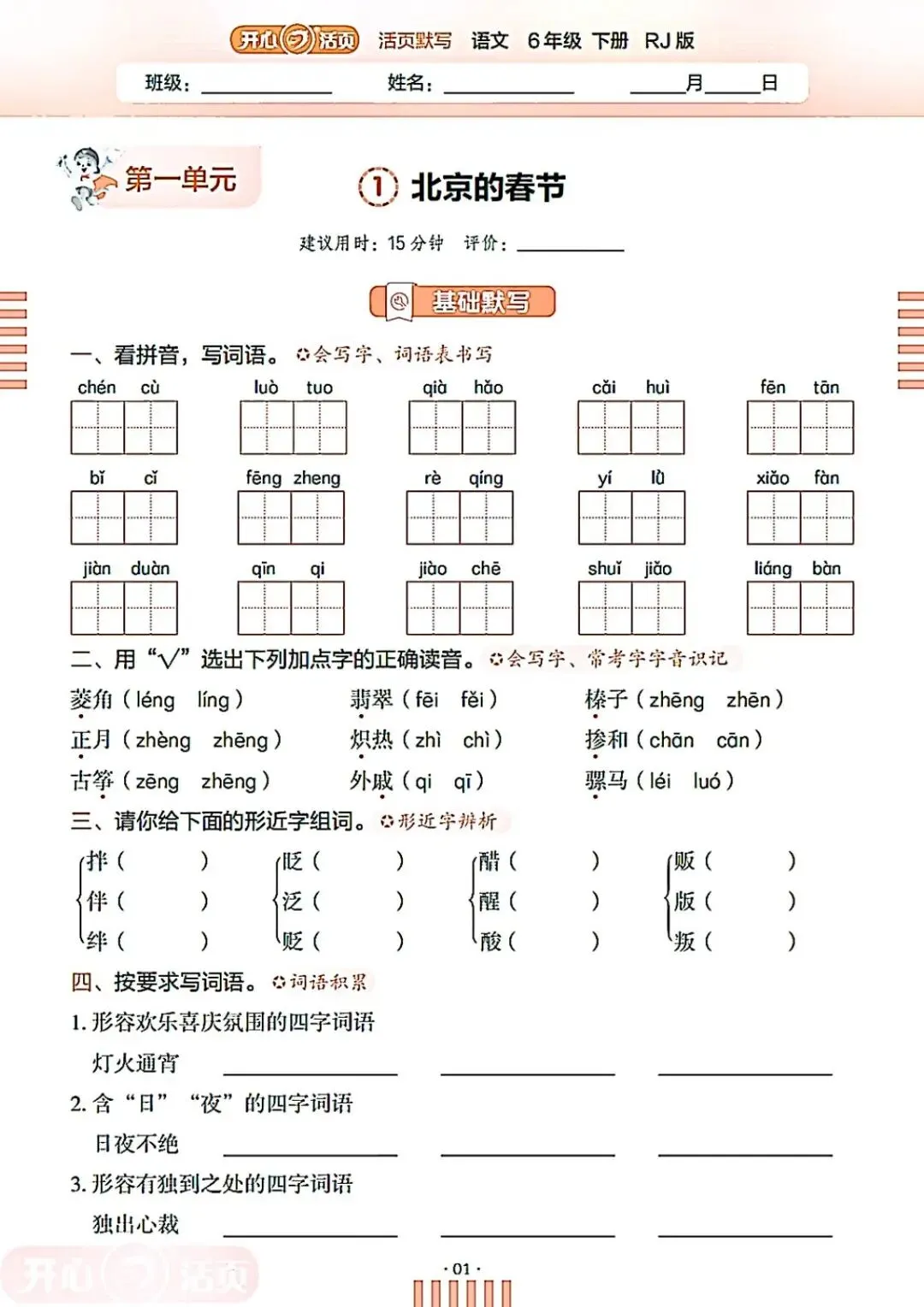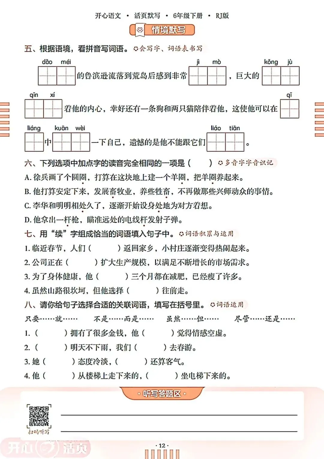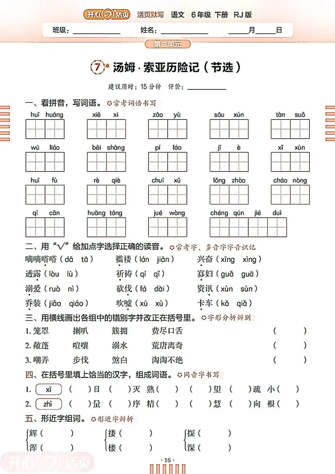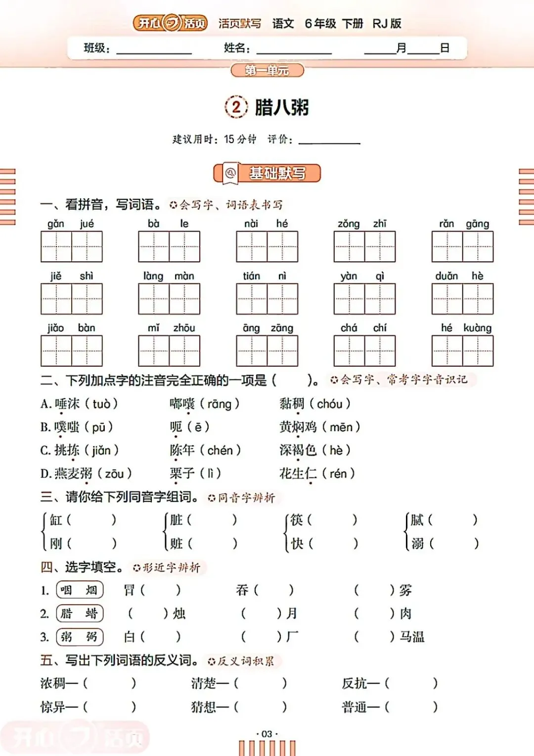 6年级下册语文《开心活页默写》(领高清PDF打印版)