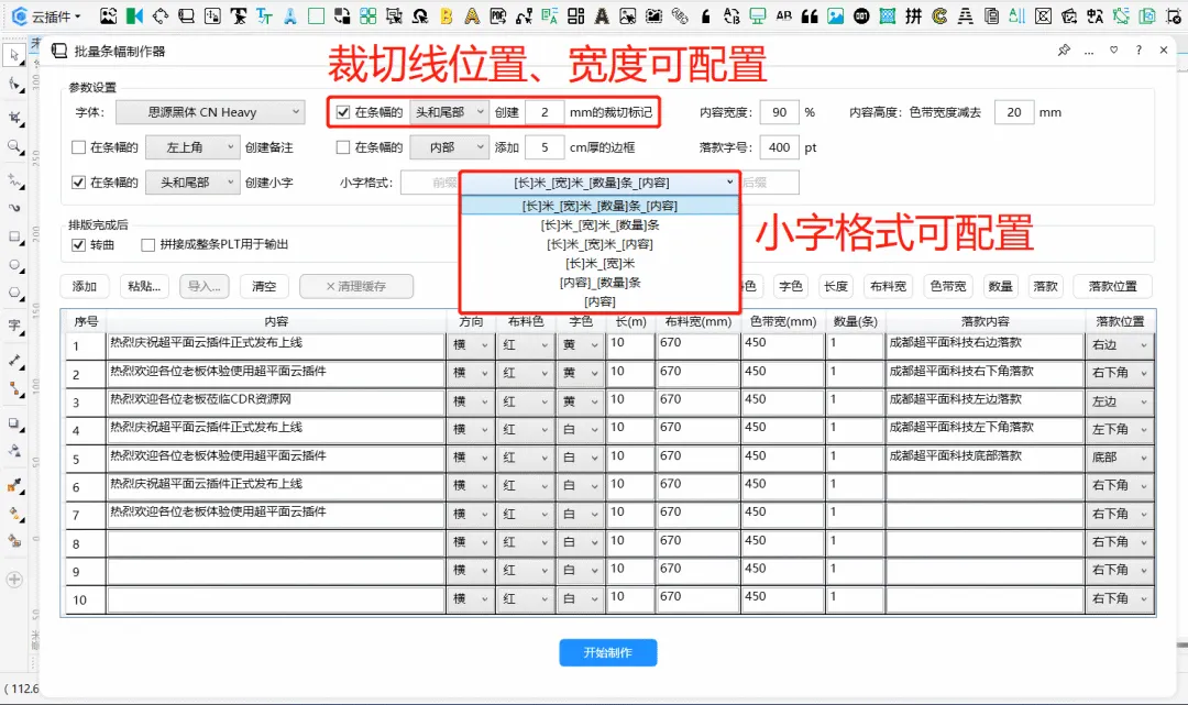 功能简介:批量条幅制作器是一款高效实用的插件,支持批量制作横幅和竖幅,并可一键导出PLT文件。用户可快速配置条幅的内容、方向、布料色、字色、长度、宽度、数量、落款及落款位置等参数,支持右边、右下角、左边、左下角、底部等5种落款位置,并自动适配横幅和竖幅。插件还提供裁切线、小字、备注、外框等功能,裁切线位置和宽度可灵活调整,小字格式支持多种组合。无论是单独制作横幅、竖幅,还是同时制作两者,插件都能自动拼接成可导出的PLT文件,并支持创建带有指定厚度边框的条幅。基于云插件的云配置能力,该插件能够满足个性化需求,适应不同用户的使用习惯。