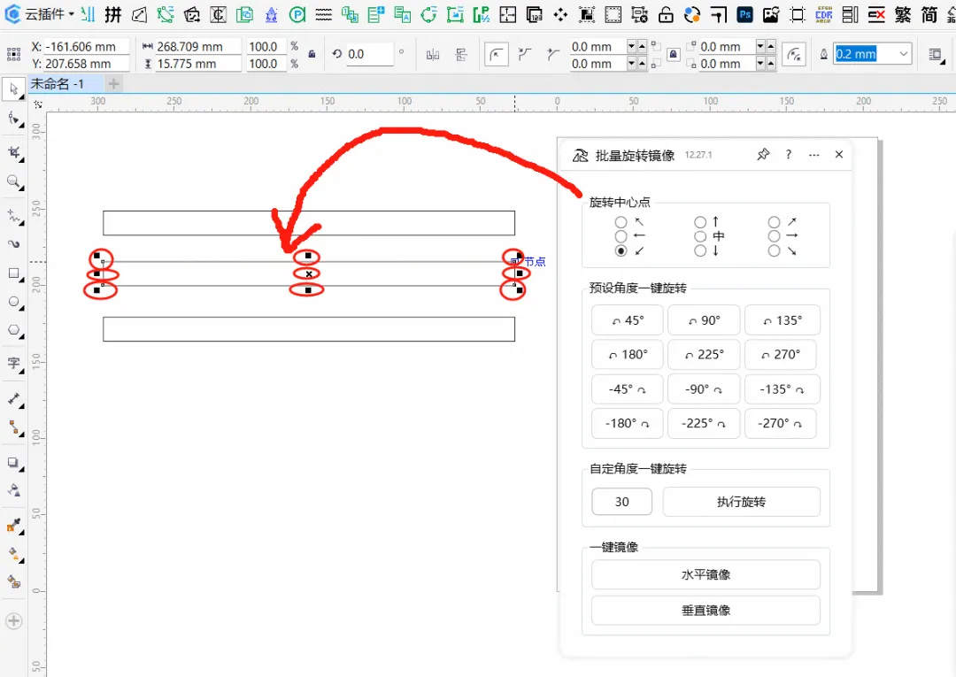 功能简介:该插件可实现将选定的图形批量旋转指定的角度或者水平垂直镜像,也可以将指定的图形旋转角度改为零,支持8个旋转中心点的设置,默认基于中心点旋转。