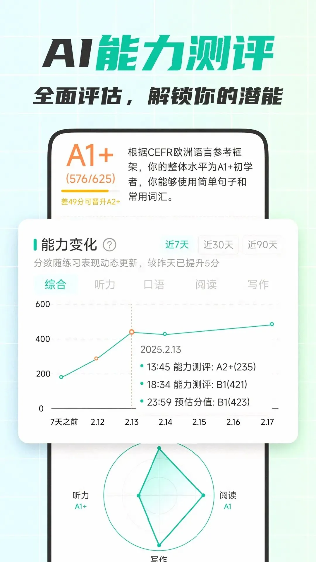 可栗口语的5分钟AI精准能力测评,基于CEFR欧洲通用语言标准,能快速从A0到C2精准定位你的职场英语水平,出具专业分级报告的同时,直接生成定制化提升方案。比如你是市场岗需要商务谈判口语,系统会自动推送谈判开场白、议价话术等针对性内容,避免盲目背通用英语。