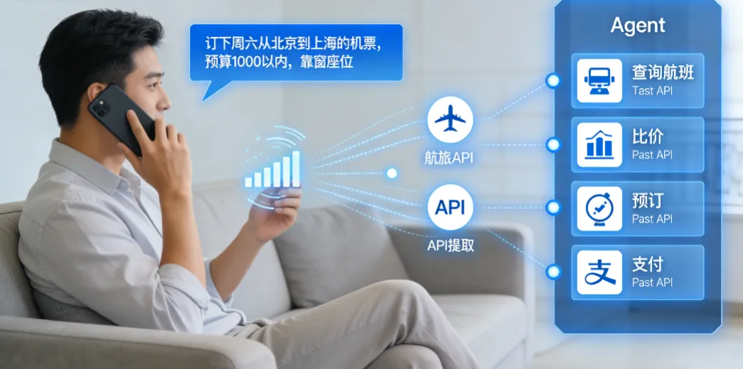 比如,你想订一张机票,不需要自己打开航旅App,只需要告诉自己的Agent“订下周六从北京到上海的机票,预算1000以内,靠窗座位”,你的Agent就会代表你,调用航旅、支付等相关的API,完成查询、比价、预订、支付等所有操作;