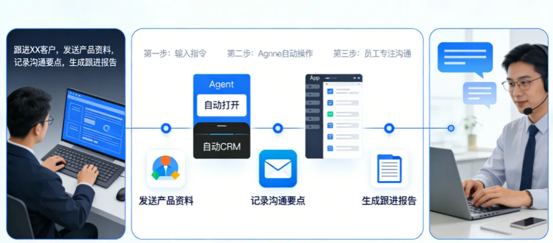 再比如,企业要跟进一个客户,不需要员工打开CRM、邮箱、文档等App,只需要让企业Agent执行“跟进XX客户,发送产品资料,记录沟通要点,生成跟进报告”,Agent就会自主完成所有操作,员工只需专注于核心的沟通工作。
