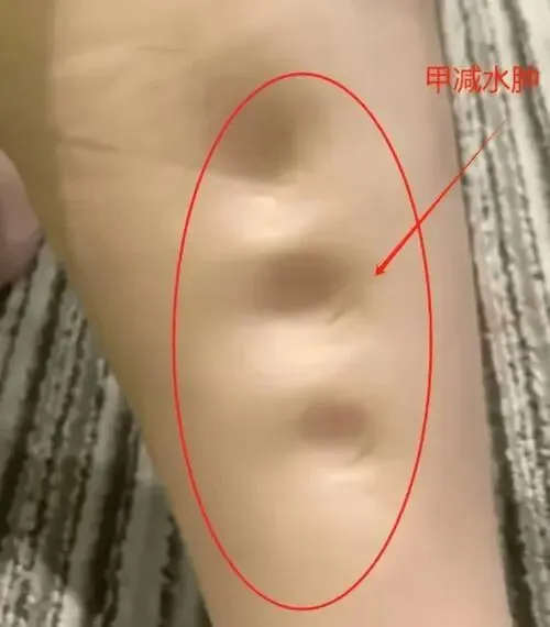 甲减黏液性水肿:皮肤硬邦邦的,按下去像按在发面团上,松开后凹陷恢复非常缓慢,而且不随体位改变而消退。