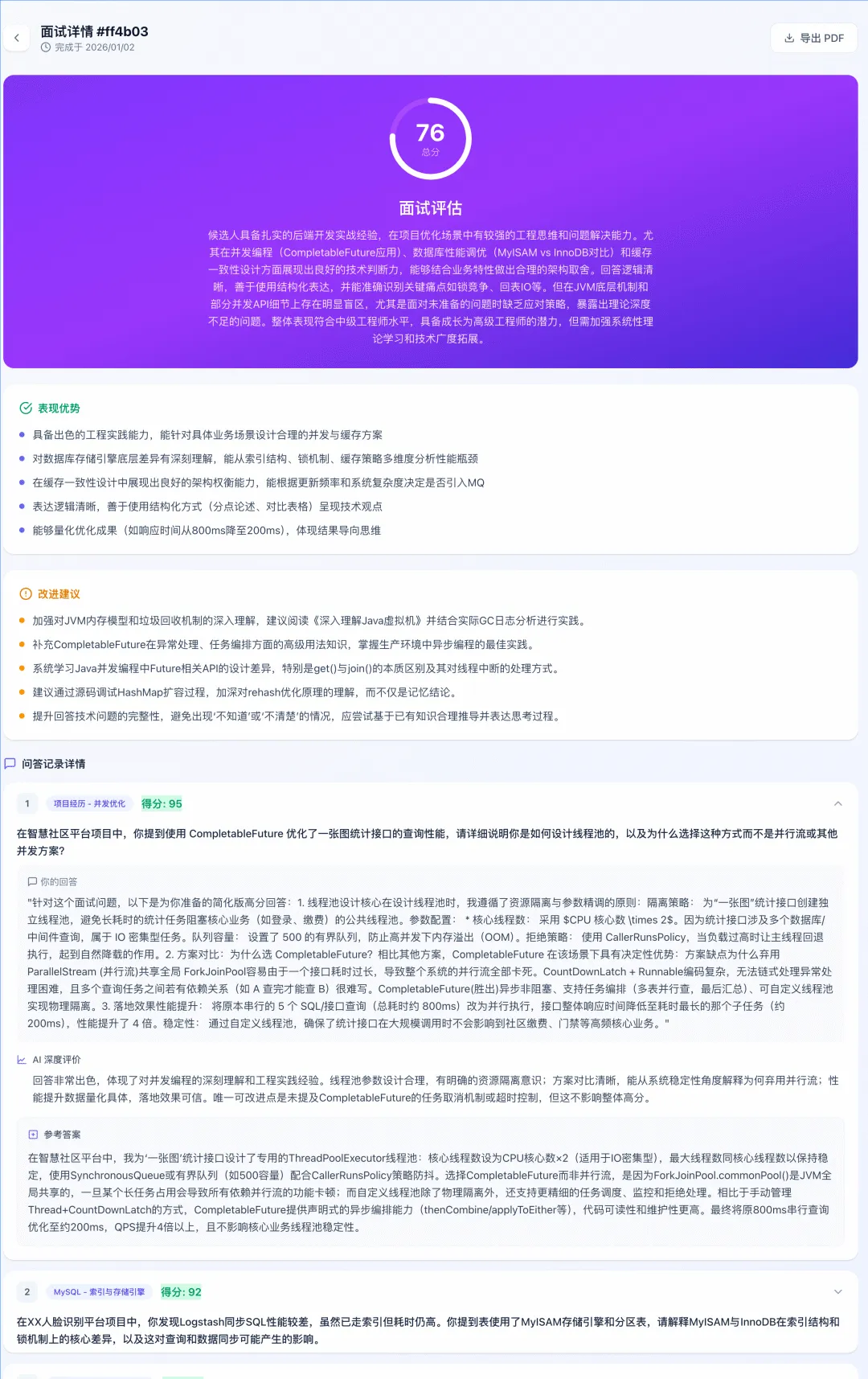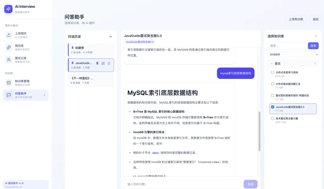 模拟面试侧强调按简历内容出题、可配置追问条数,并在长对话场景用分批评估缓解上下文过长带来的不稳定,再汇总成改进建议与统计。知识库模块则负责文档分块、异步向量化与基于向量的检索增强问答,前端用流式输出呈现对话,整体体验接近日常使用的助手产品。