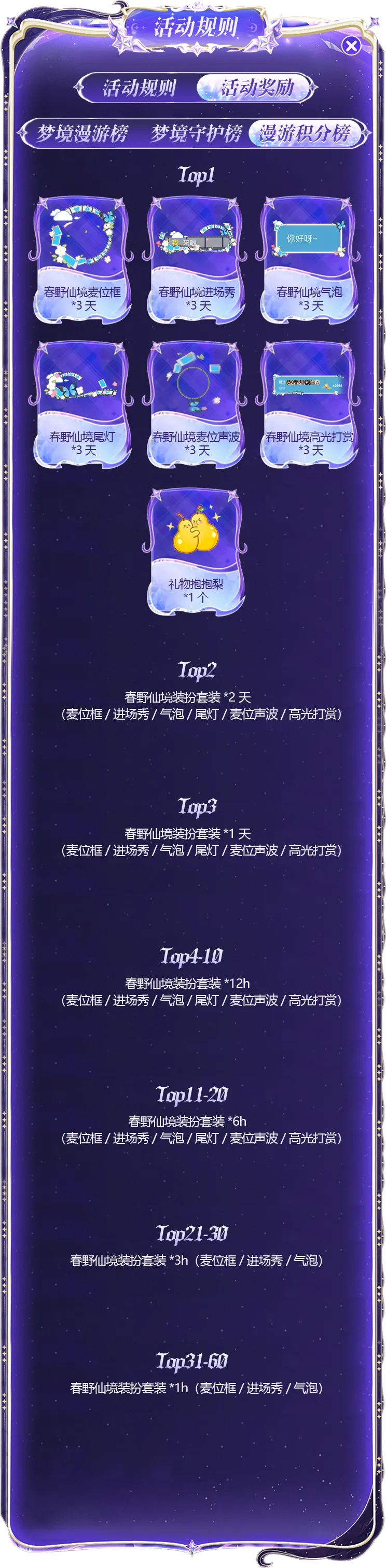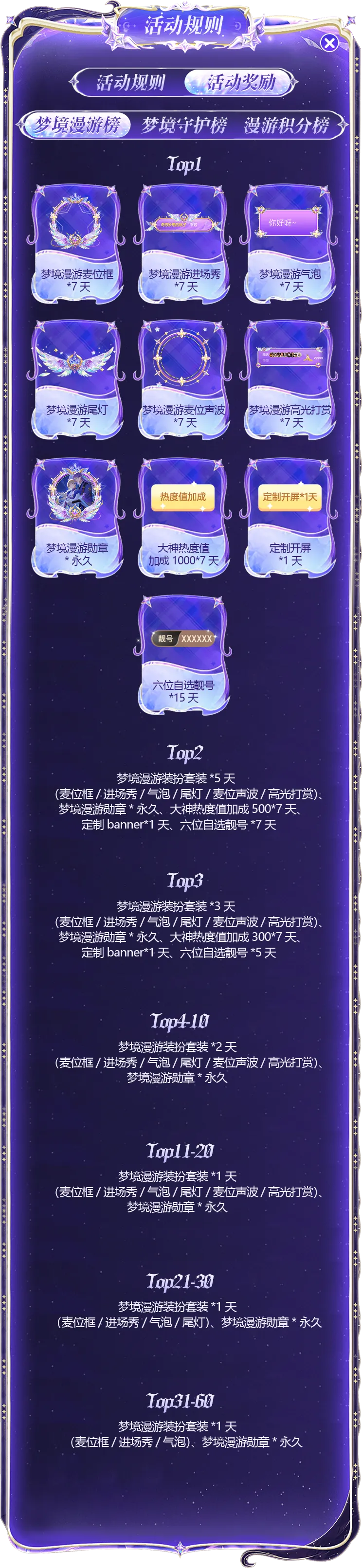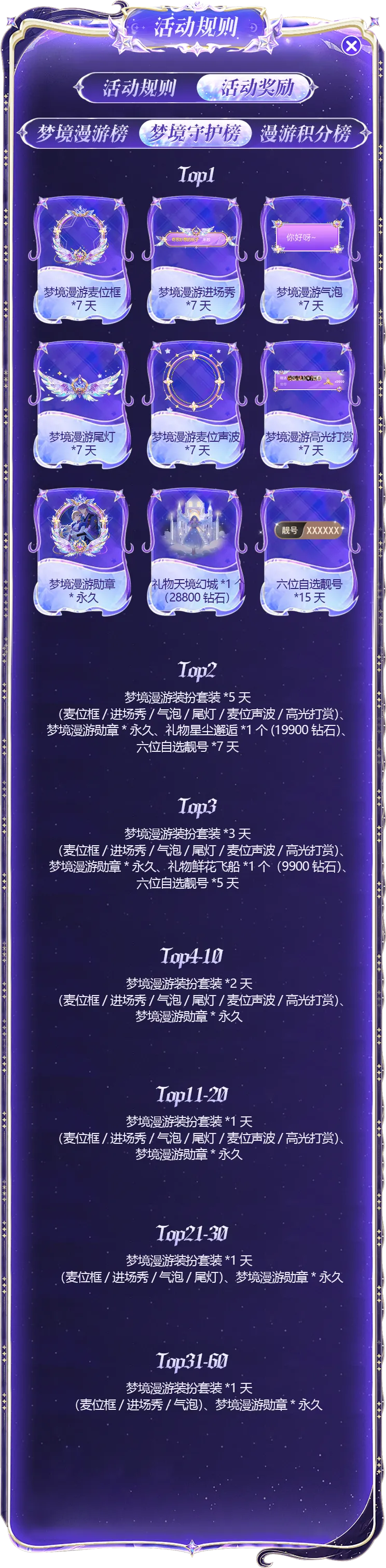 梦境守护榜:活动期间送出活动限定礼物可以获得守护值,计算方法:1 钻石=1 守护值