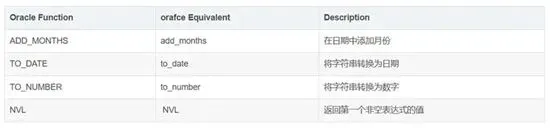 orafce提供了数百个函数,模拟了Oracle数据库中的相应功能。下面表格展示了部分orafce函数和它们在Oracle中的等价物。