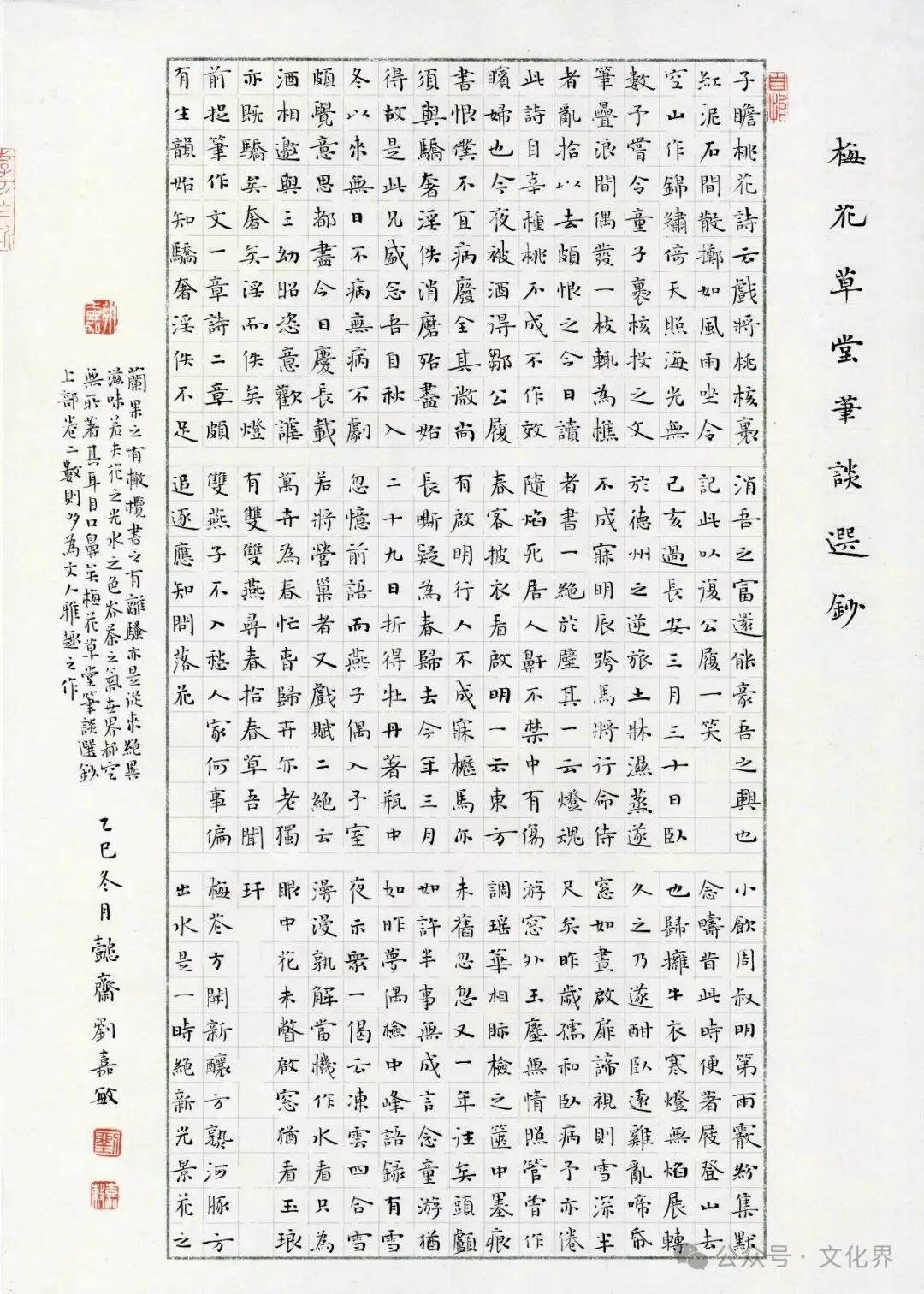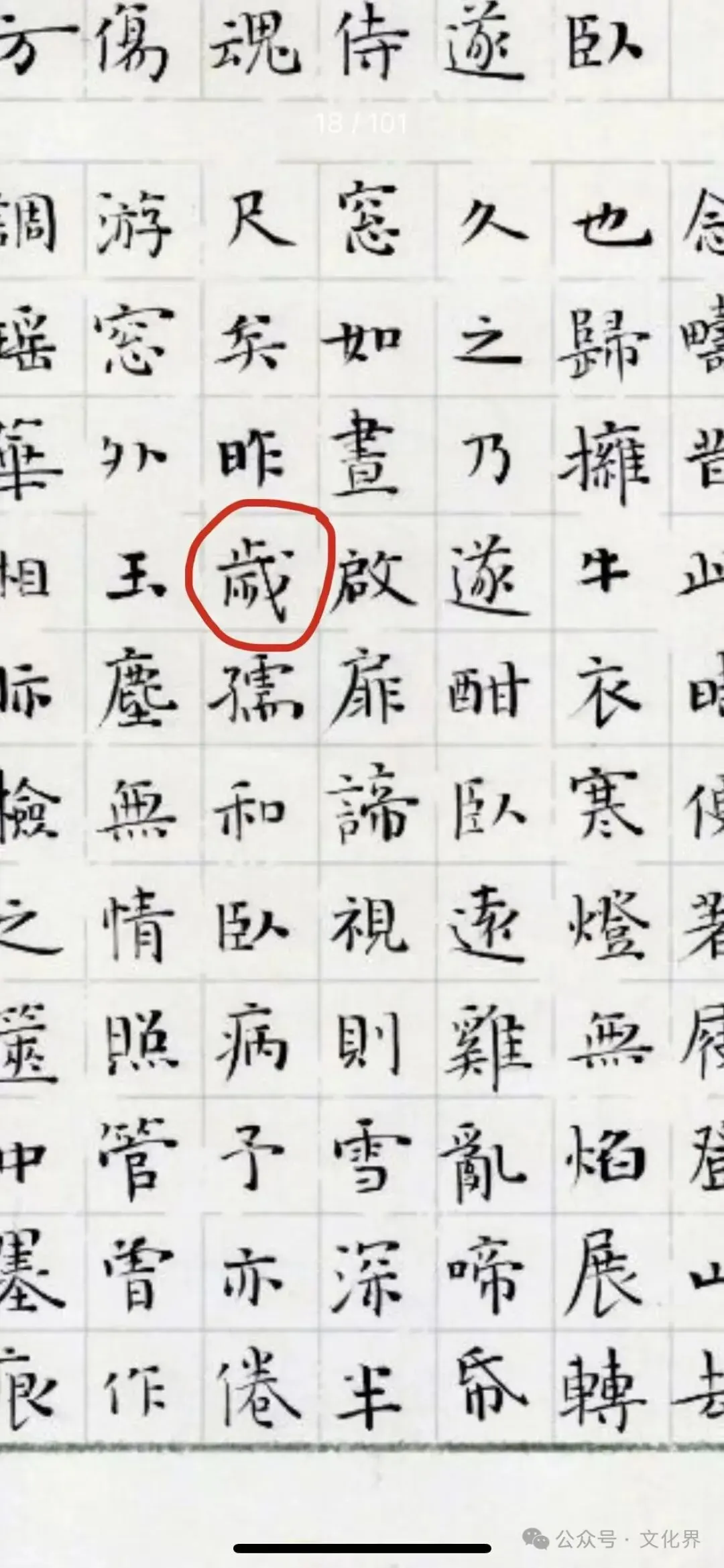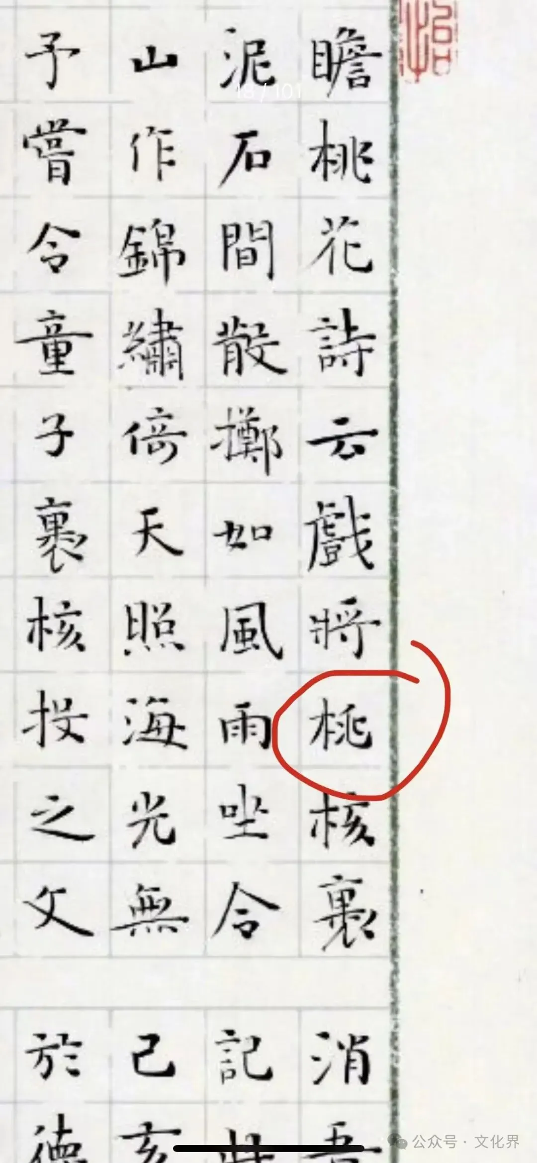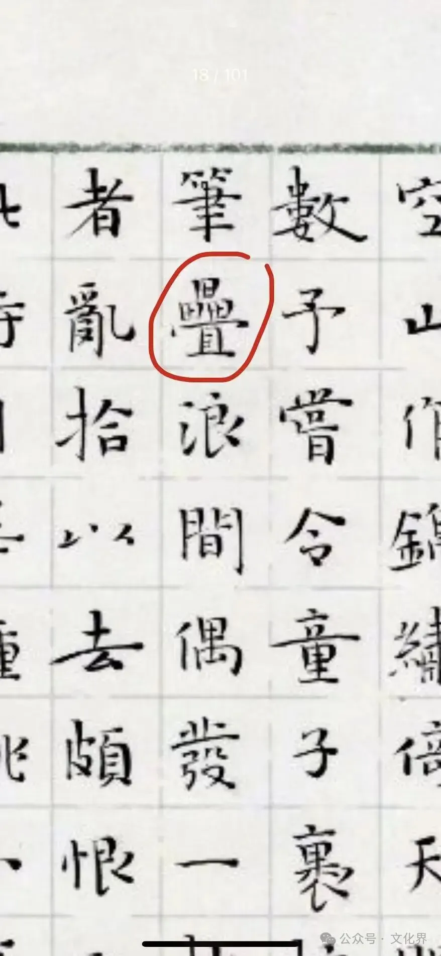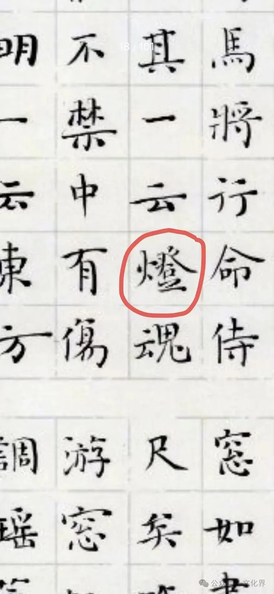 四、银奖刘嘉敏楷书作品中,与作者提供的原文本比较,“叠、矉、展”三字无误,“一”字不多,“澷、畴、旧、岁”等字写法可认为无错,“桃“写法存疑,“灯”字写法有误。正文“之”后漏“有”字属实。