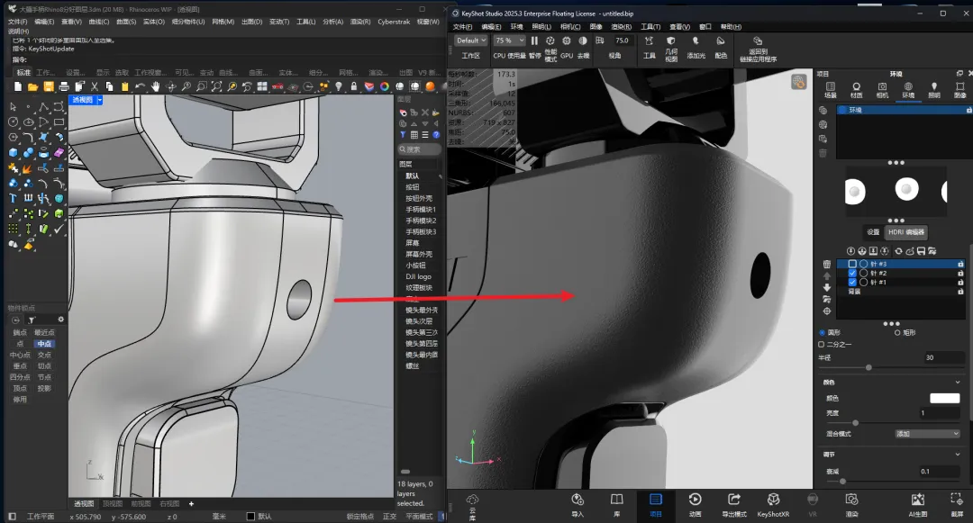 这个插件能实现 Rhino 和 KeyShot 双向联动,不管你在 Rhino 里修改模型细节、调整尺寸,还是优化结构,KeyShot 里的模型都会实时同步更新,不用重新导出、不用重新调材质光影,省去所有返工麻烦,把宝贵的时间都用在设计本身!