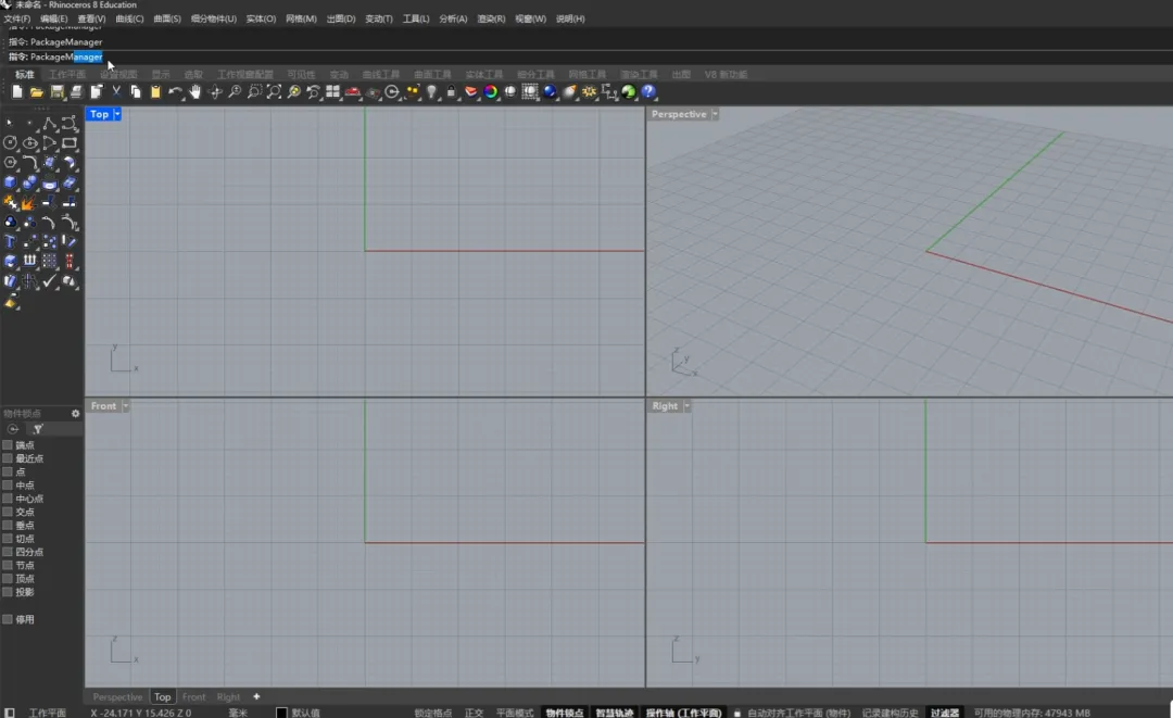 在犀牛的命令管理器中下载对应插件;打开犀牛,指令栏输入:PackageManager,打开命令管理器。