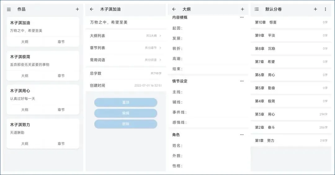 点击右上角加号按钮可以编辑作品名称和作品简介,它支持的功能包括:大纲列表、章节列表、常用词语、总字数和创建时间。