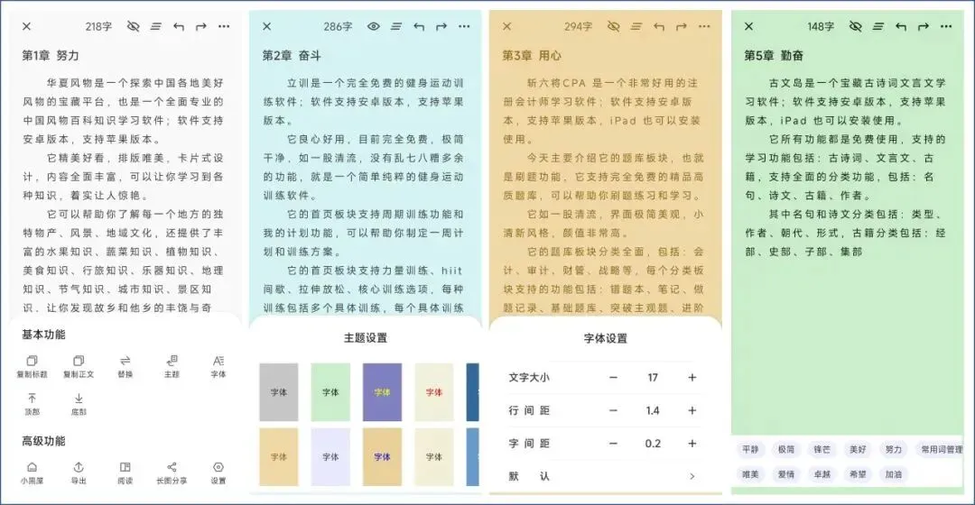 其中主题功能支持多达20多种主题任意切换,字体设置包括文字大小、行间距、字间距等。