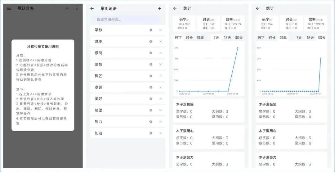 最后,它还支持素材管理、主题管理和统计功能,统计功能支持以唯美图表展示码字时长、效率、字数等,非常直观。