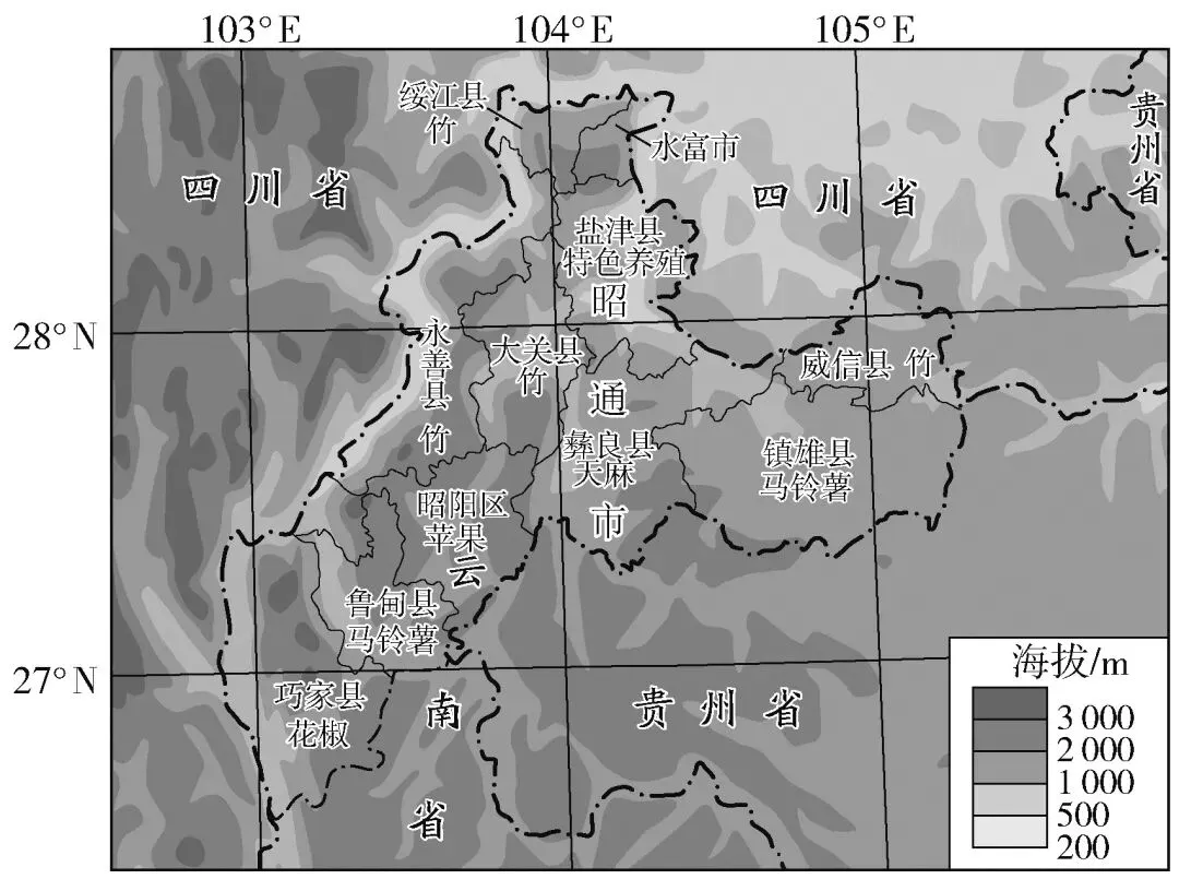 云南省昭通市平均海拔1 950米,有汉、彝、回、苗等24个民族633万人,是一个集“山区、革命老区、民族散杂区”为一体的农业大市,辖9县1市1区。当地充分利用得天独厚的原生态自然条件,创新发展模式,精心打造县域特色产业基地,大力发展苹果、竹、马铃薯、天麻、花椒、特色养殖等六大高原特色农业。近年来,昭通市积极发展乡村新业态,着力打造“云中苗寨”“坝上花海”等致富示范工程。如图示意昭通市不同县域特色产业分布。