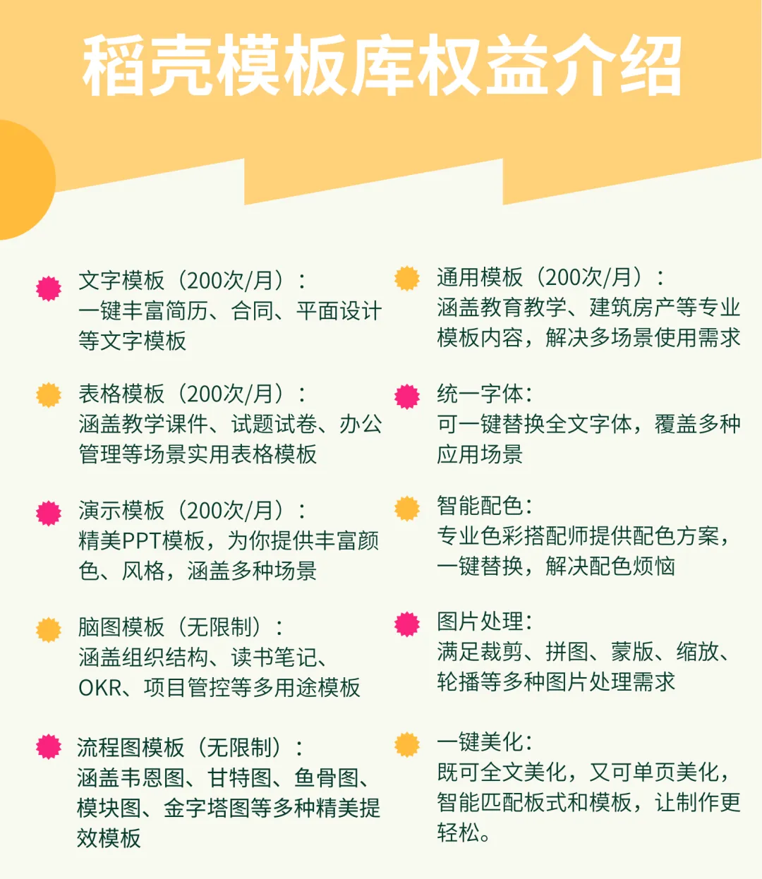 包含30+项模板相关权益,涵盖各类行业的演示、表格、文字模板,各类流程图模板,还具备全文美化、生成智能图形功能。