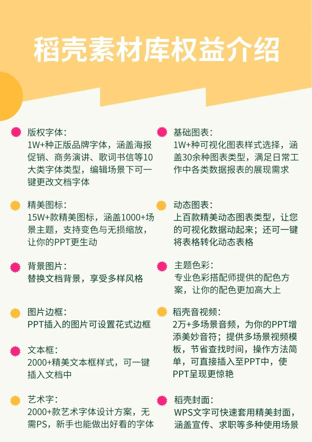 包含近30项素材相关权益,涵盖1W+种正版品牌字体、15W+款精美图标及1W+种可视化图表样式,可满足文档、PPT及数据报表等多场景需求。