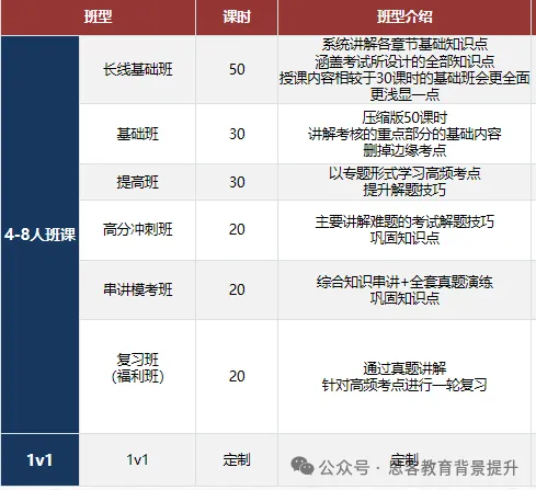➤ 班型设置:基础班50H;提高班30H;冲刺班20H