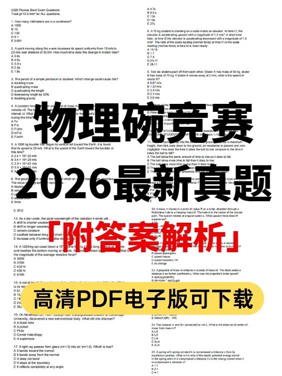 由美国AAPT主办,全球11国500+高中参与,前30%是耶鲁、MIT、牛剑加分项,TOP100选手37%进美TOP30!2026年物理碗竞赛已经结束,静默期结束,橘子老师已经整理出来了2026年物理碗竞赛的最新真题和详细答案解析,物理碗考后该如何查分呢?