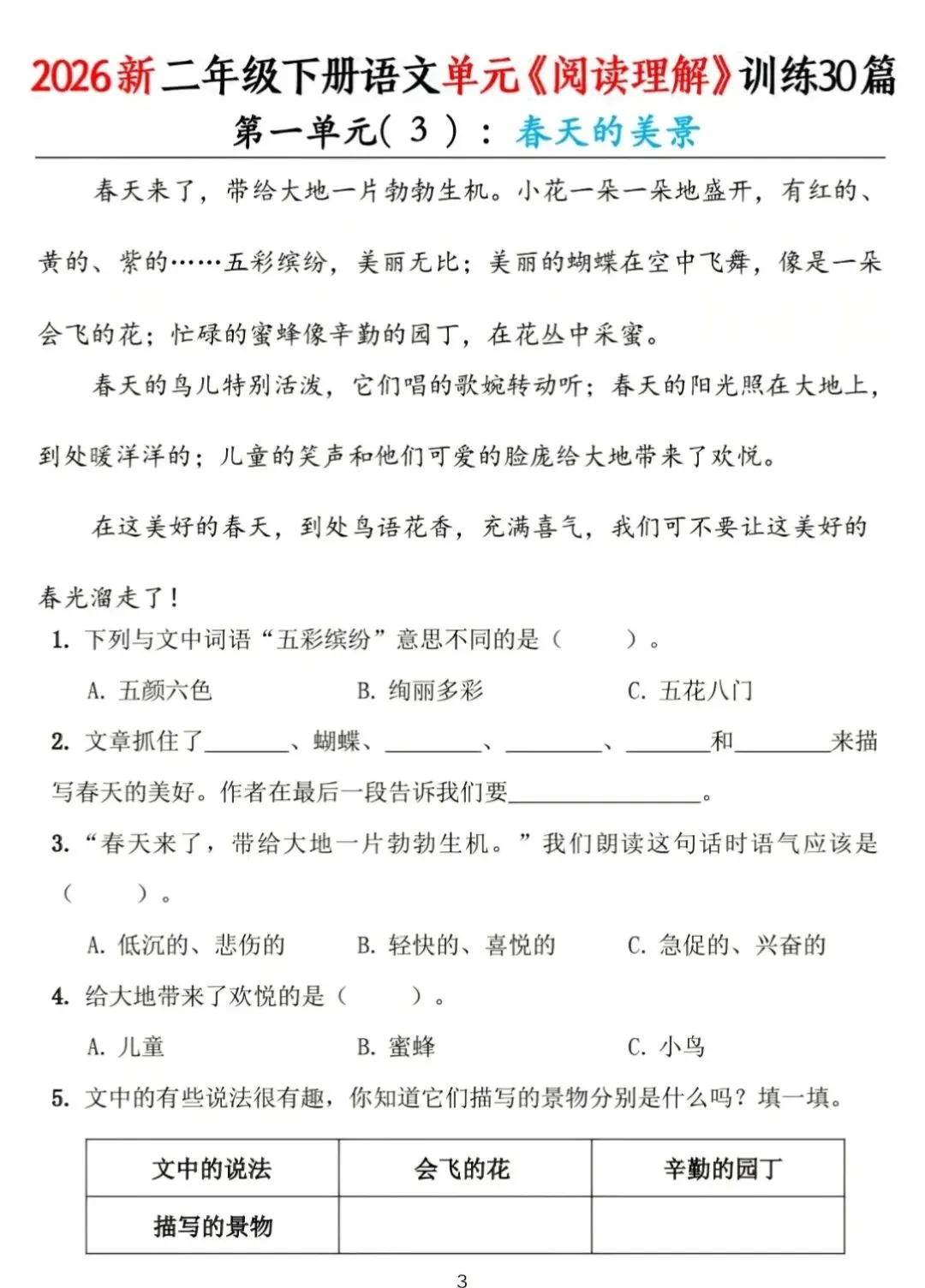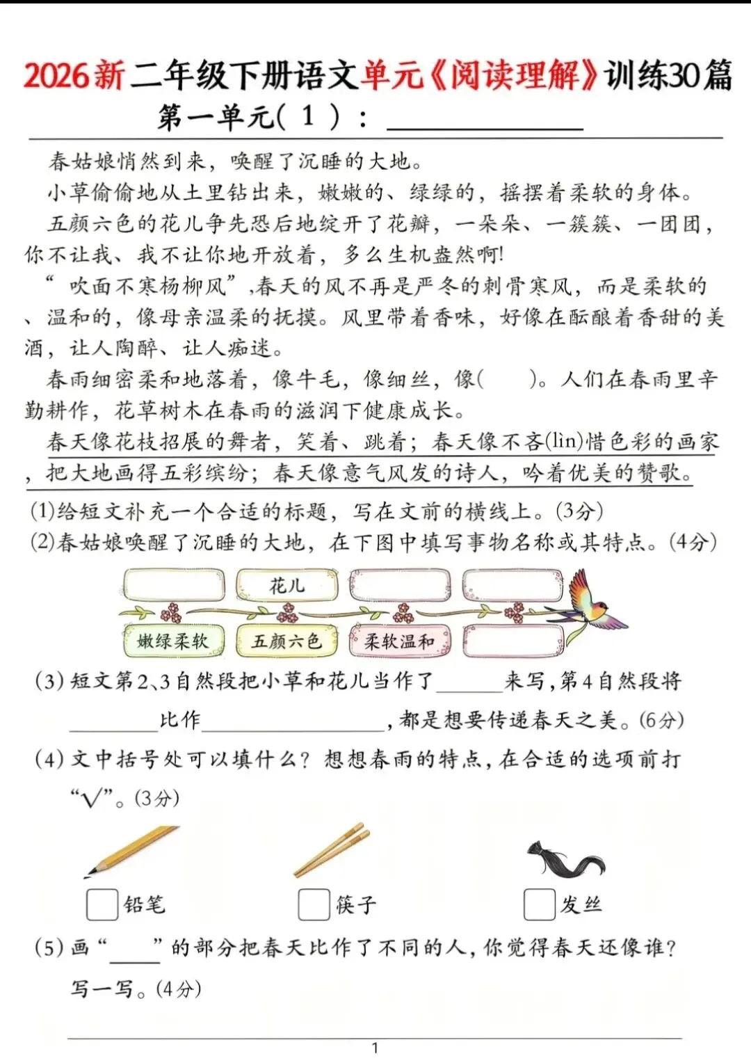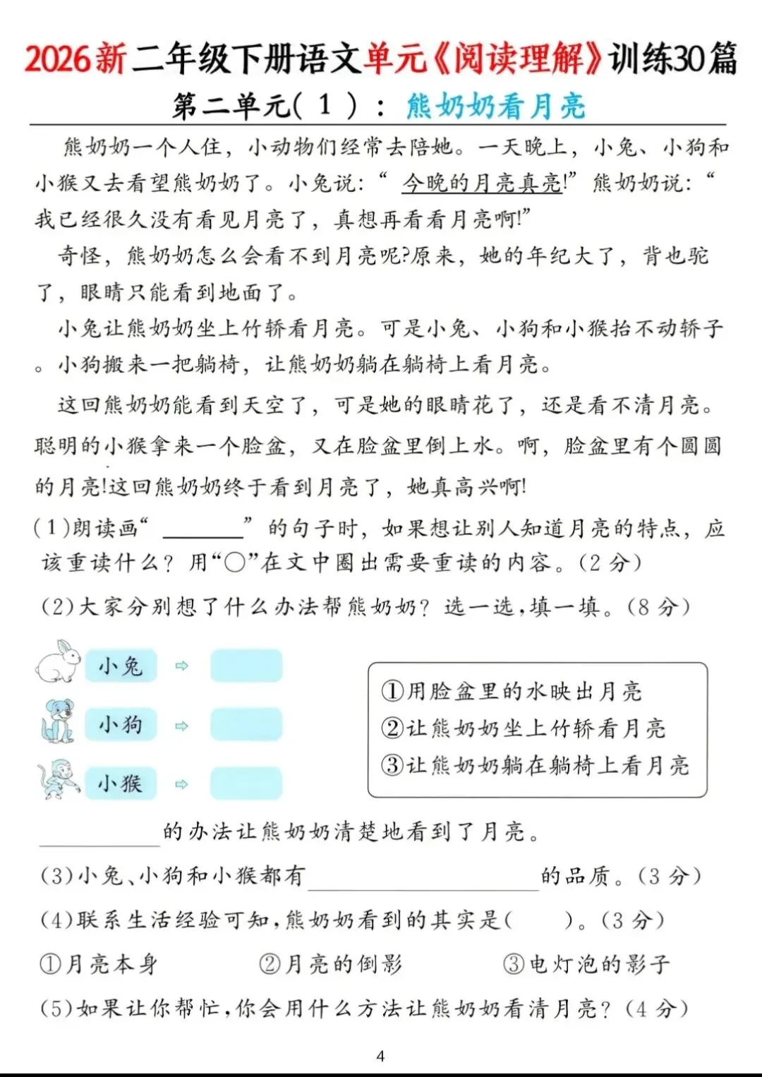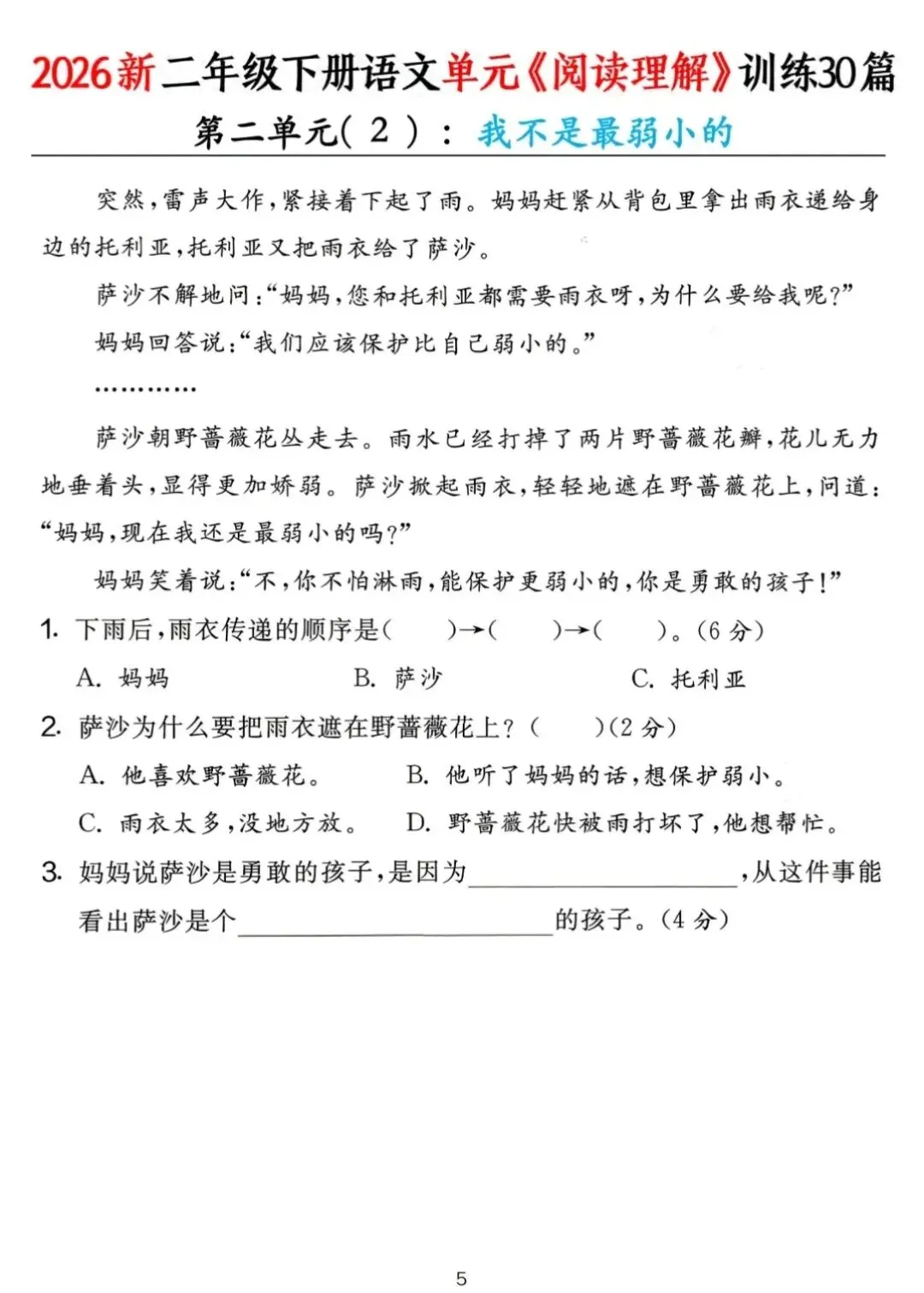 二年级下册语文《单元阅读理解训练》,电子版可打印
