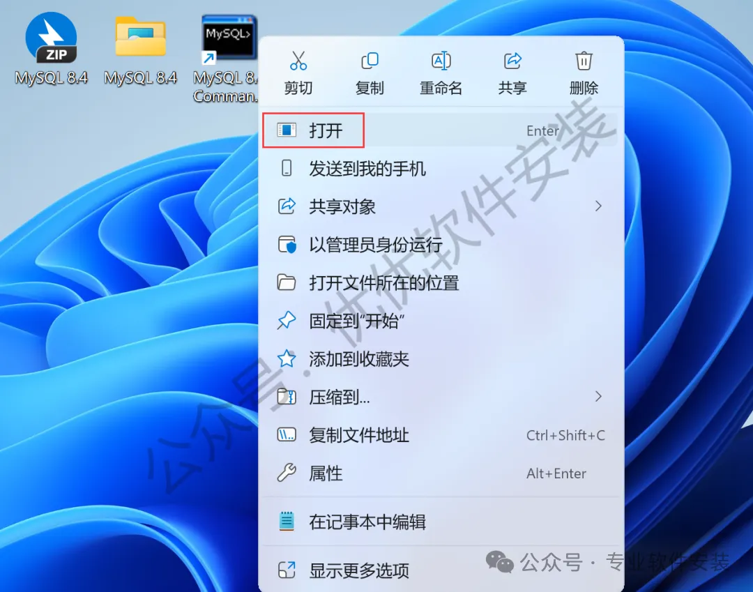 23、右键桌面上的【MySQL 8.4软件图标】,点击【打开】