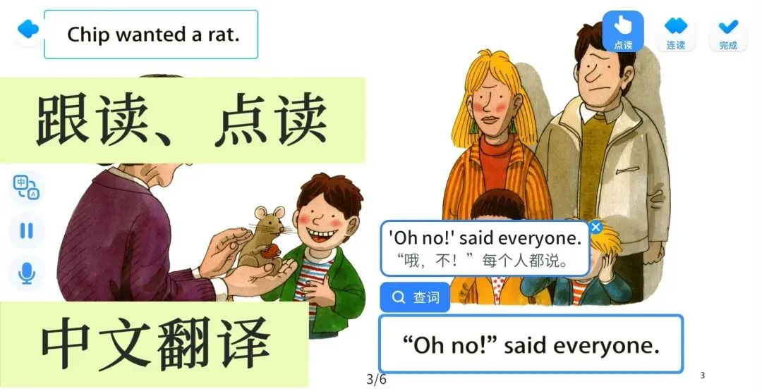 而且不是简单的电子书,是带听音频、点读、跟读、录音、查词、中文翻译,还有AI打分!