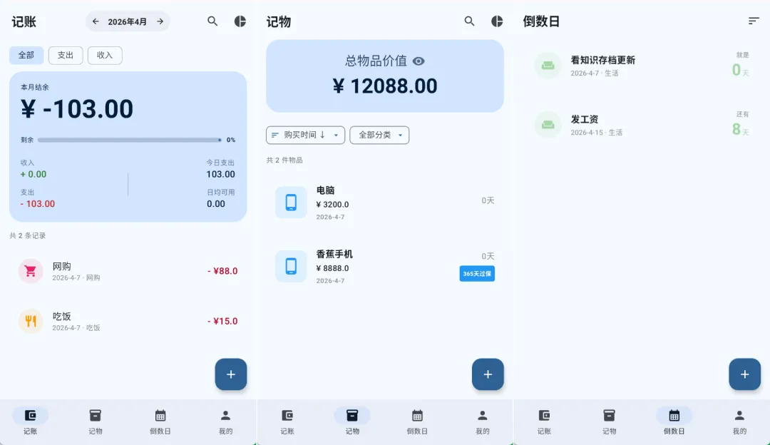 支持记账、资产记录、倒数日