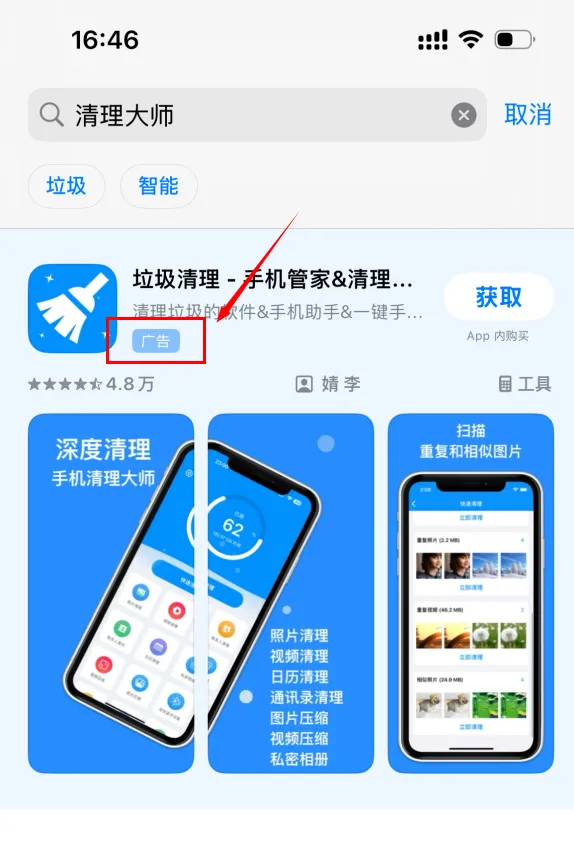 再看看这个清理大师,注意上面那个下边的“广告”两个字。