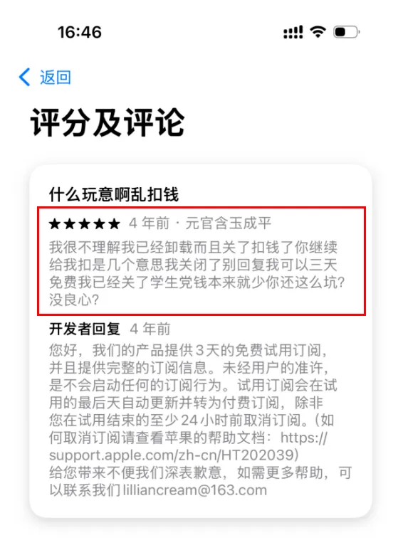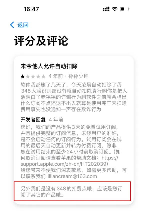 像这个评论,也是删除的软件但依然在扣费,但开发者的回复是,他们没有348的扣费点,应该是订阅了其它的产品。