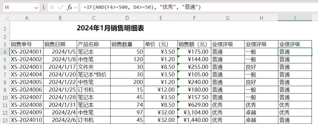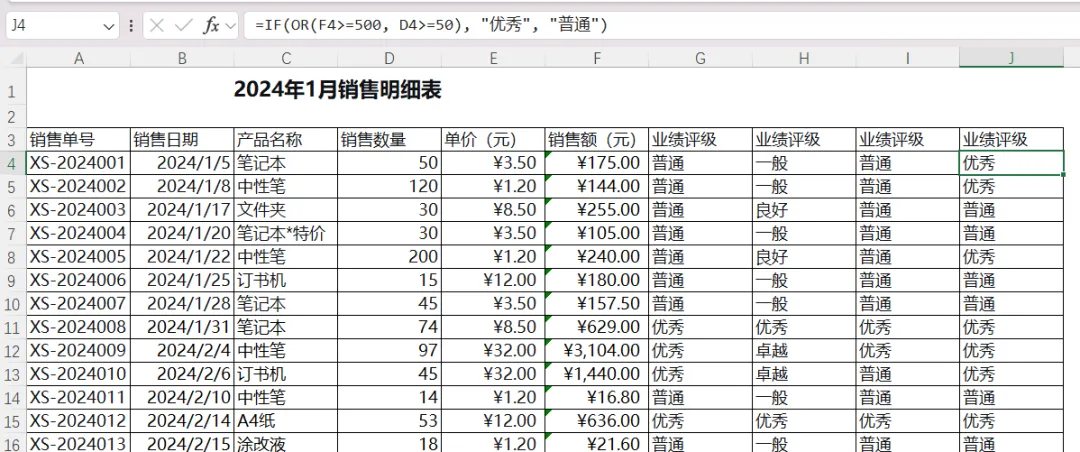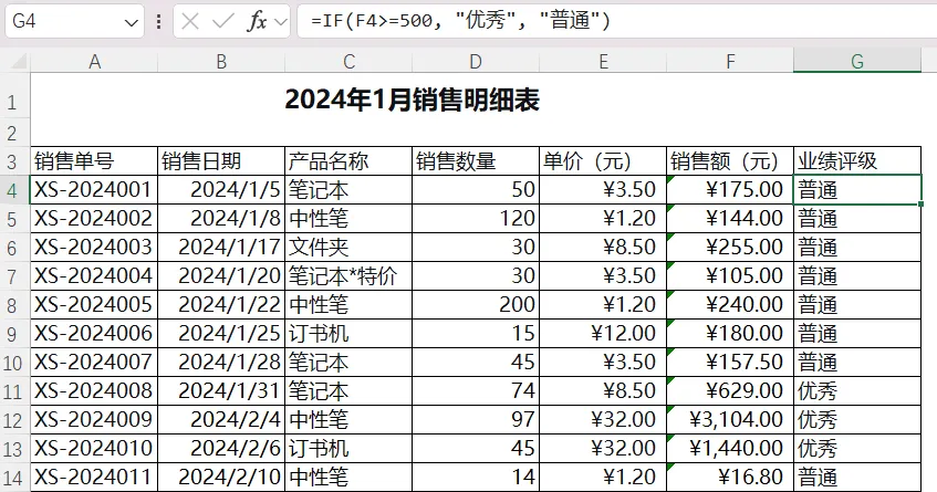 假设我们想给每一笔销售订单评定等级:销售额≥500为“优秀”,否则为“普通”。