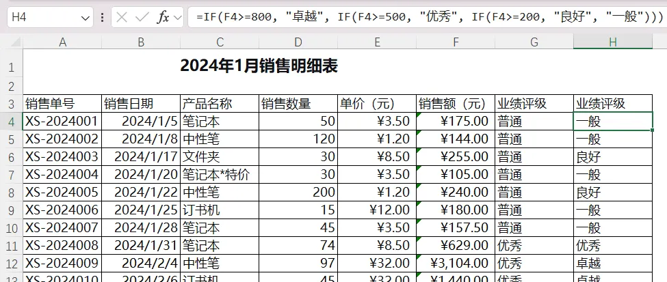 =IF(F4>=800, "卓越", IF(F4>=500, "优秀", IF(F4>=200, "良好", "一般"))) -
