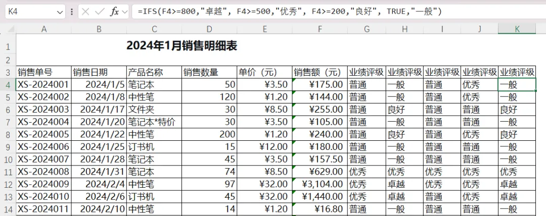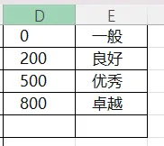 =IFS(F4>=800,"卓越", F4>=500,"优秀", F4>=200,"良好", TRUE,"一般")(TRUE作为默认情况,相当于最后的else)