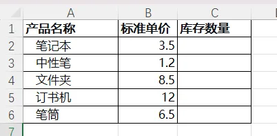 在A1输入 “产品名称”,B1输入 “标准单价”,C1输入 “库存数量”(可选)。