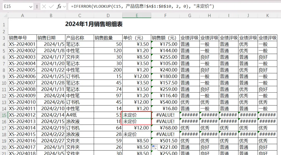 #N/A错误影响美观,可以用IFERROR将错误值替换为“未定价”或空。