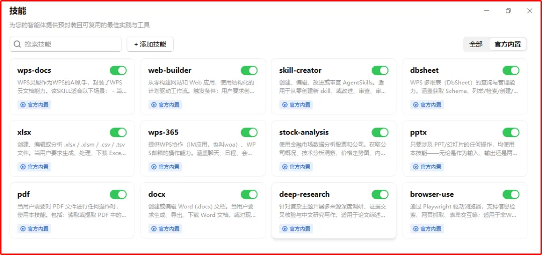 在接入技能方面,安装好的WPS灵犀Claw,自动内置了WPS官方的多个技能包。