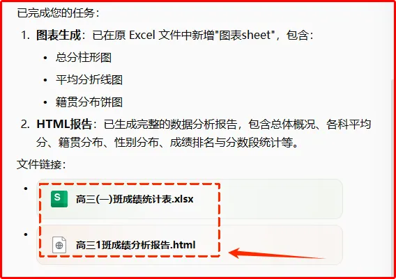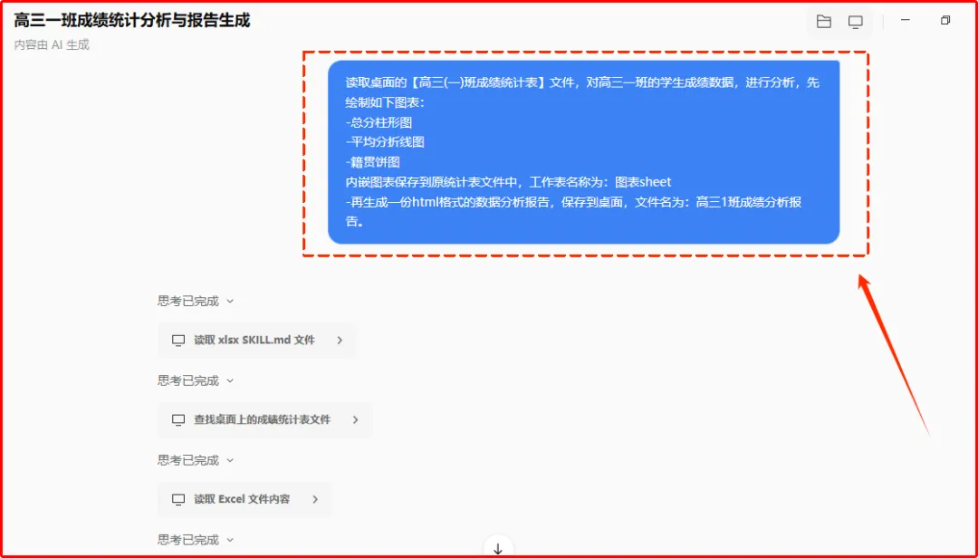 这里,我们让AI龙虾,读取电脑本地桌面上的成绩表数据,并且根据数据,生成三张数据图表,还要把图表,直接保存在原来的数据表文件里。最后再进行数据分析,生成一份网页html格式的数据分析报告。
