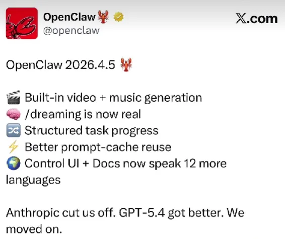 OpenClaw官方在X.com上用一句话概括了这次更新最炸裂的能力: