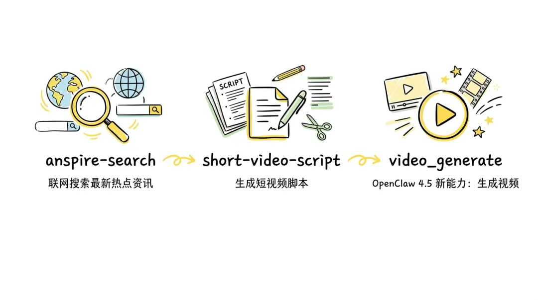 这是4.5版本最受关注的新能力。配合已有的工具链,它已经跑通了完整的”热点追踪视频”流水线: