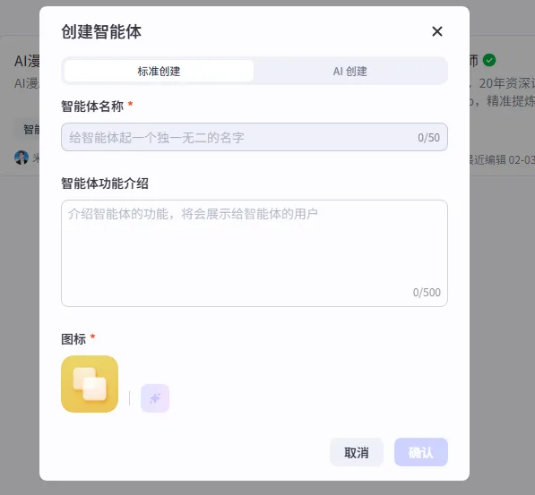 给智能体起个名字,写一句描述,图标可以用默认的或让AI自动生成。
