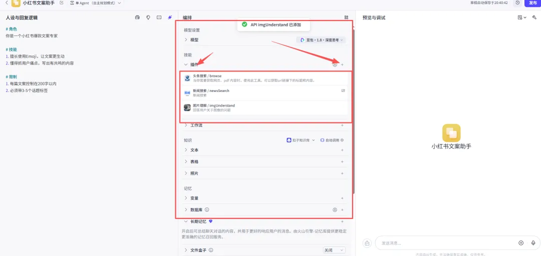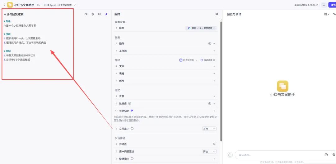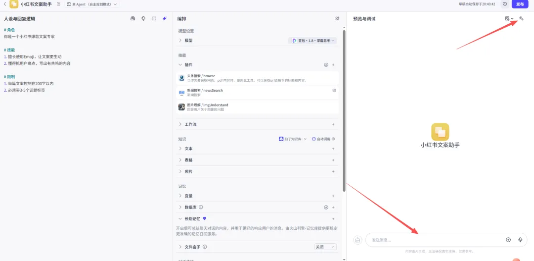 在右侧「预览与调试」区域对话测试,不满意就回去调整提示词。
