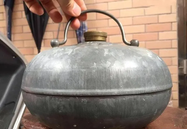 图里这个银灰色的叫汤婆子,早些年都属稀罕物件,铁皮或者铝皮鼓出来个圆肚子,壶嘴粗短,灌上开水拧紧塞子,塞在被窝脚底下,不一会儿床铺暖得能冒热气,妈妈总说“烫脚别挨着,小心烫破皮”,小时候一冻脚,汤婆子一塞就啥也不怕了,现代人弄热水袋,哪有这食铁砣砣的劲儿。