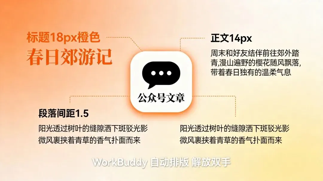 我的工作流 1. 安装”公众号排版”插件 2. 输入指令:”把桌面article.md按公众号格式排版,标题18px橙色,正文14px,段落间距1.5″ 3. 自动输出排版好的HTML文件