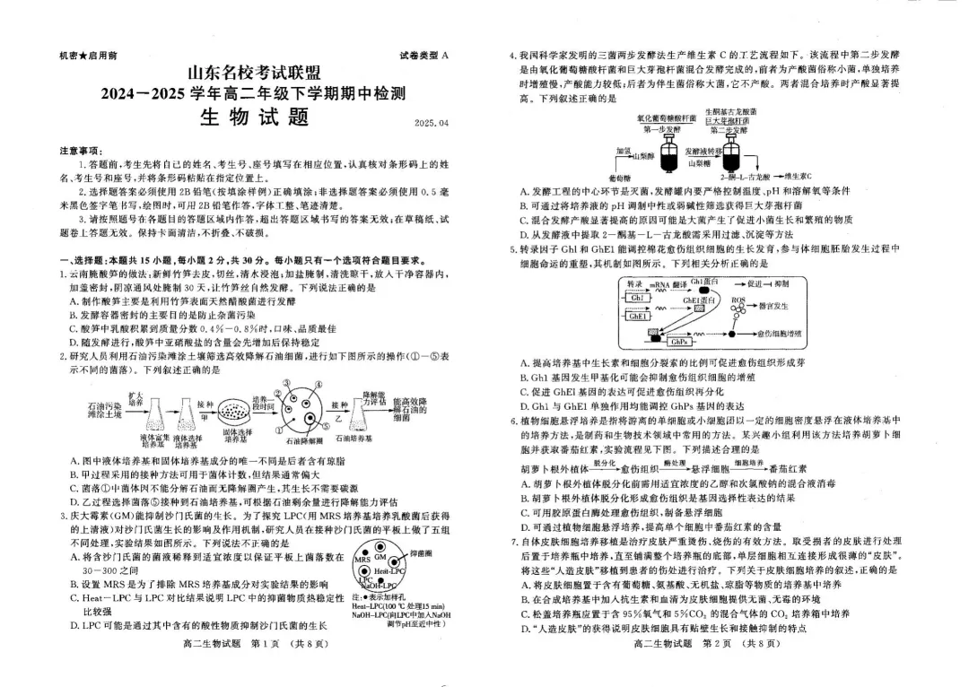 【可下载】山东名校考试联盟2024—2025学年高二年级生物学学期中试题 高二生物(2)
