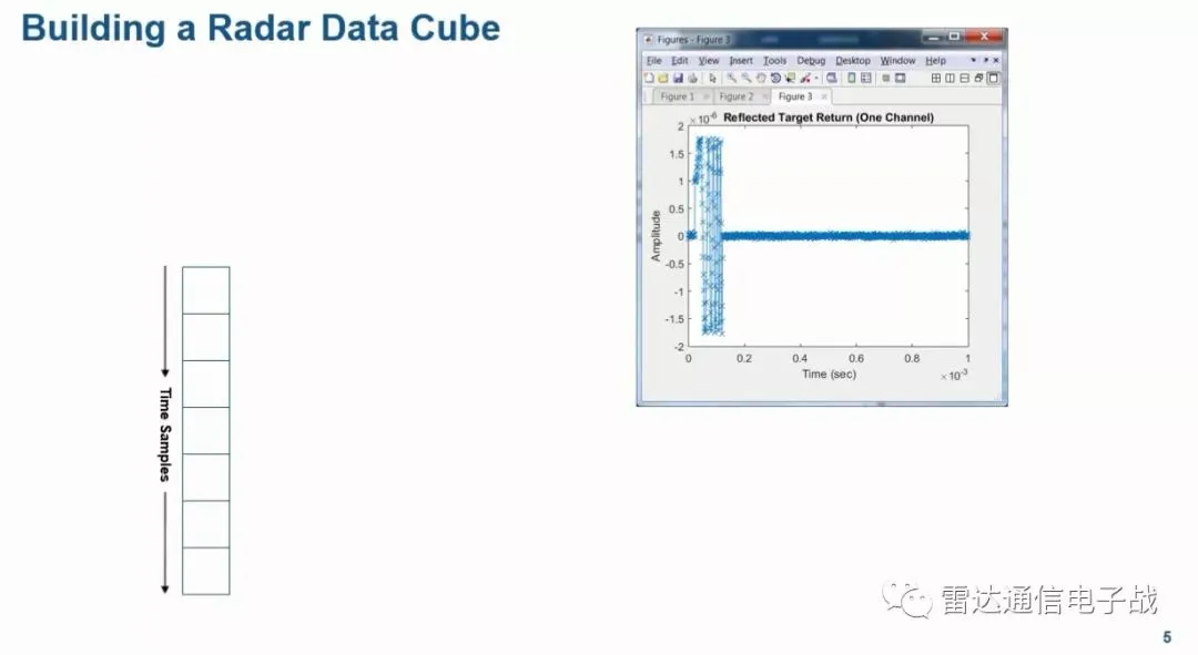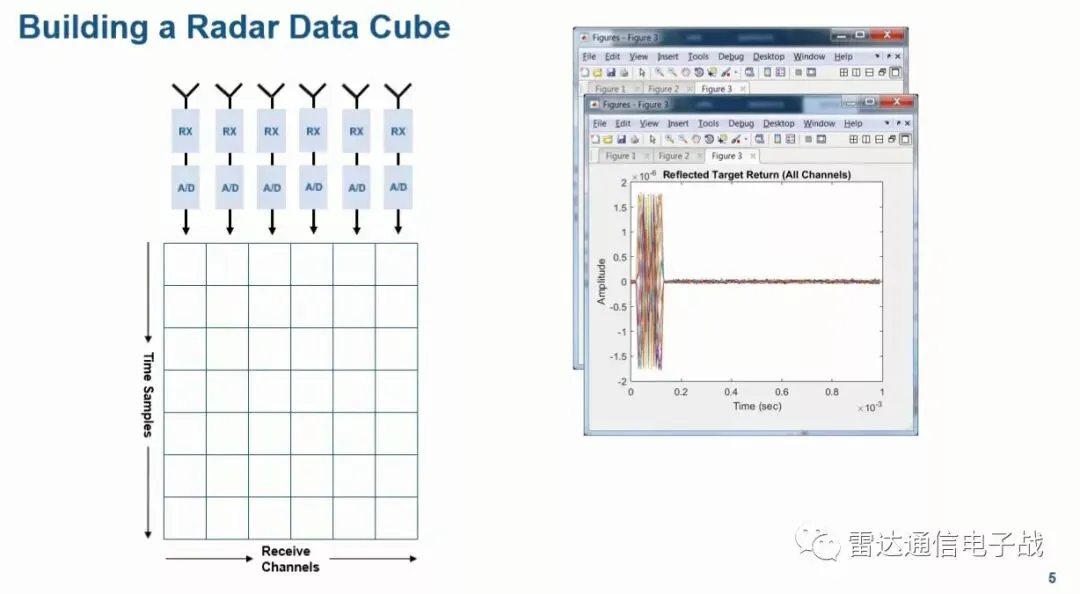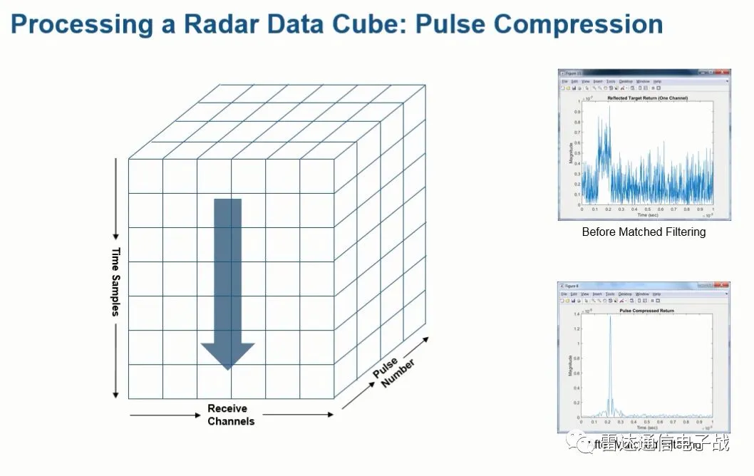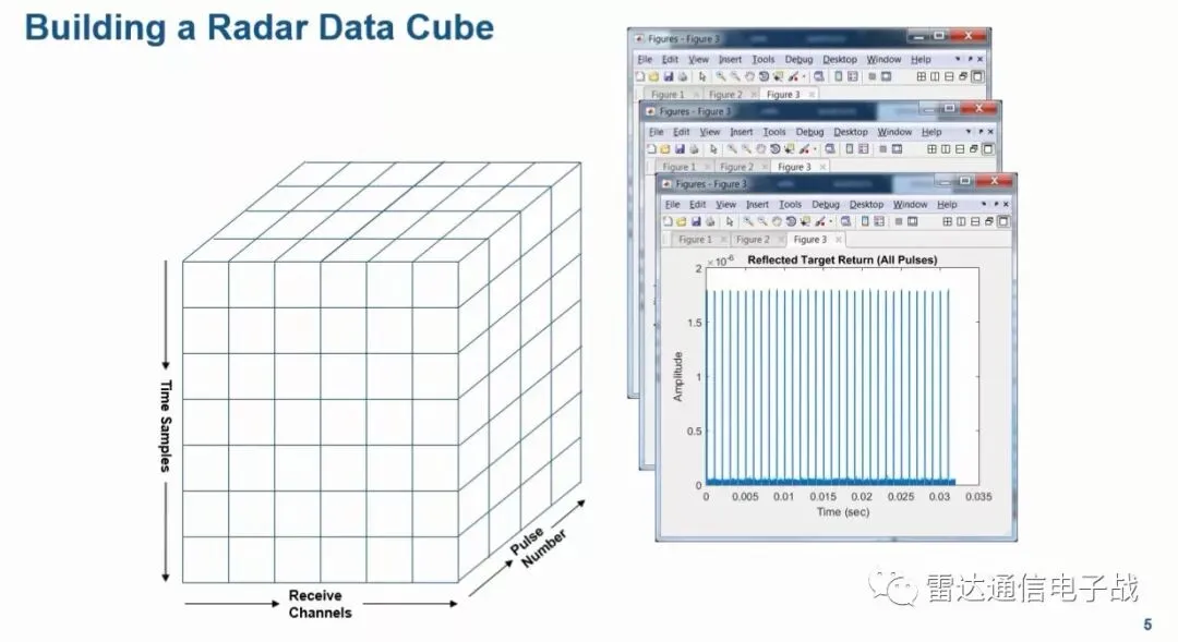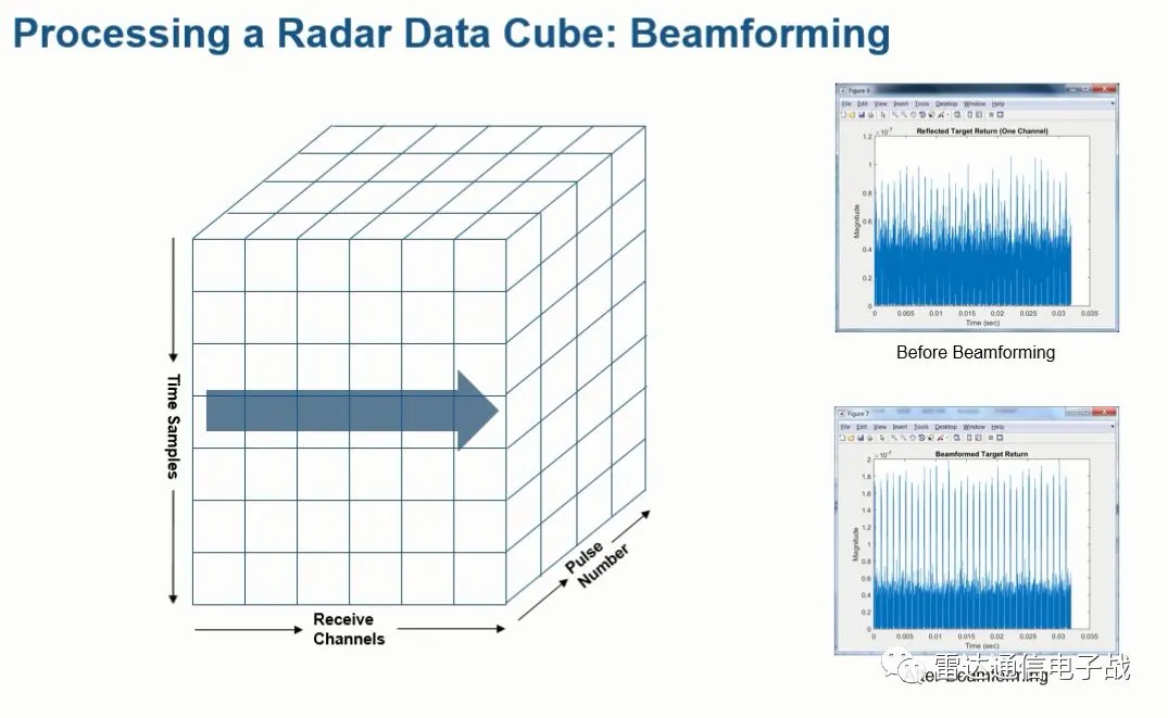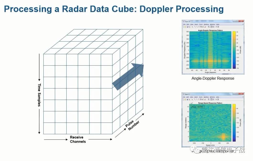 因此,N个通道,单个脉冲的L个采样点,M个脉冲组成了上述的一个雷达数据立方体,通过对这个数据立方体的处理,可以获得目标的距离、速度和方位信息。