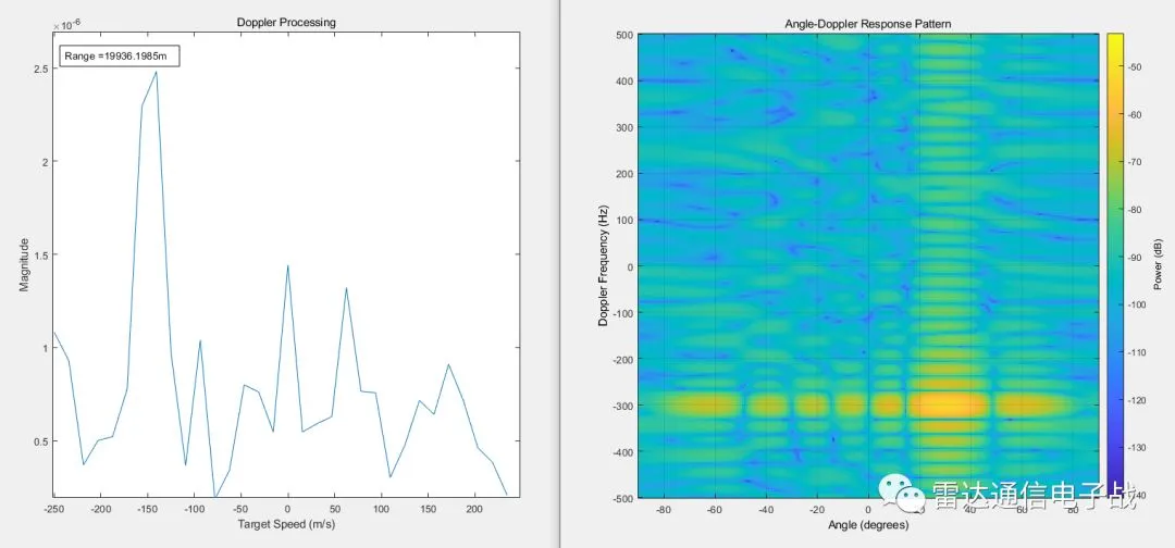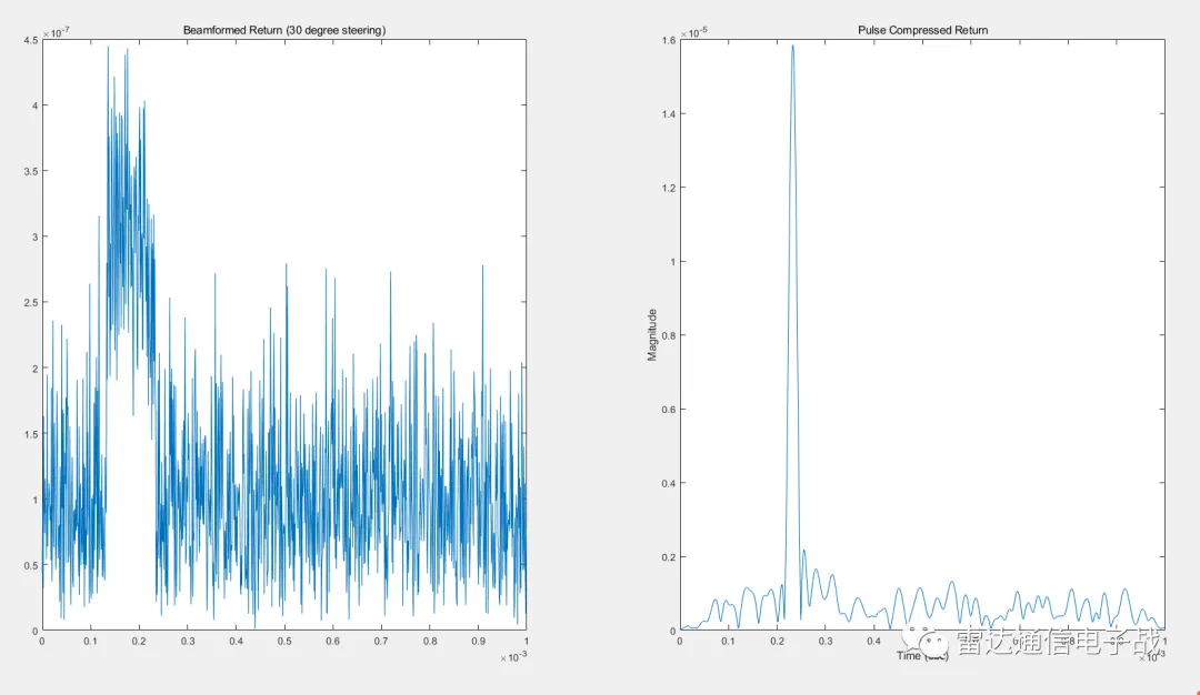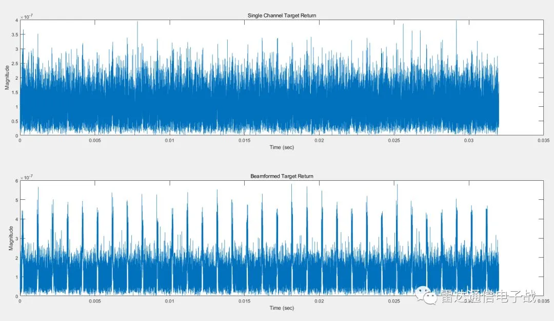从上面的仿真图可以看出波束形成之后,多个通道的数据叠加,使得回波信号得以从噪声中显现出来,信噪比得以提高,后面再进行脉冲压缩和多普勒处理。