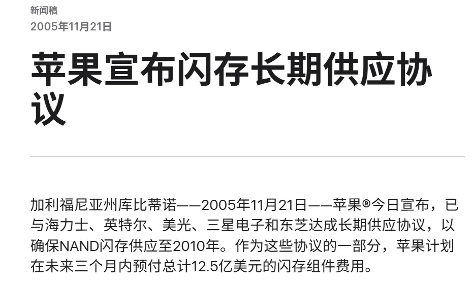 回想2005年,苹果的新款iPod Nano面世,为了彻底摆脱传统微型硬盘在抗震性、体积和功耗上的天然缺陷,开始大量采用 NAND存储,苹果提前预付巨额现金,直接锁定了东芝等厂商的产能,同时还锁定了全球顶尖的 CNC 机床数年产能,变相垄断了全铝机身技术,让竞争对手根本无法拿到核心元器件生产类似产品。