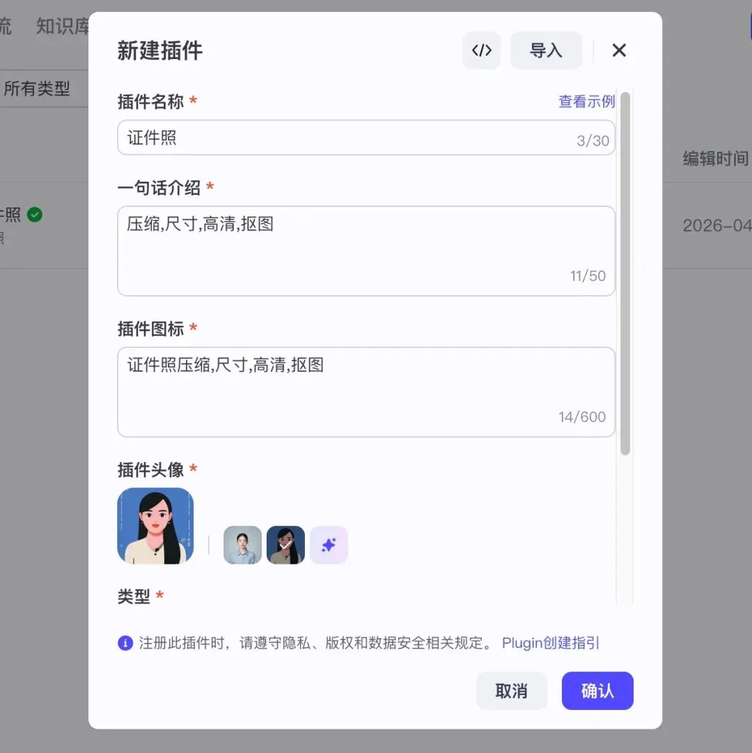 最近Coze工作流太火了,大家都在分享各种实用插件。我就想,干脆把证件照的核心功能做成Coze插件——毕竟有时候处理图片需要在工作流里连贯操作,直接调用插件比切到小程序方便太多。