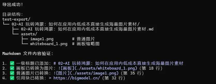 lark-doc-export 是一个用于将飞书云文档导出为本地 Markdown 文件的工具。它会自动下载文档中的图片和画板(whiteboard)缩略图,并生成结构清晰的本地文件。