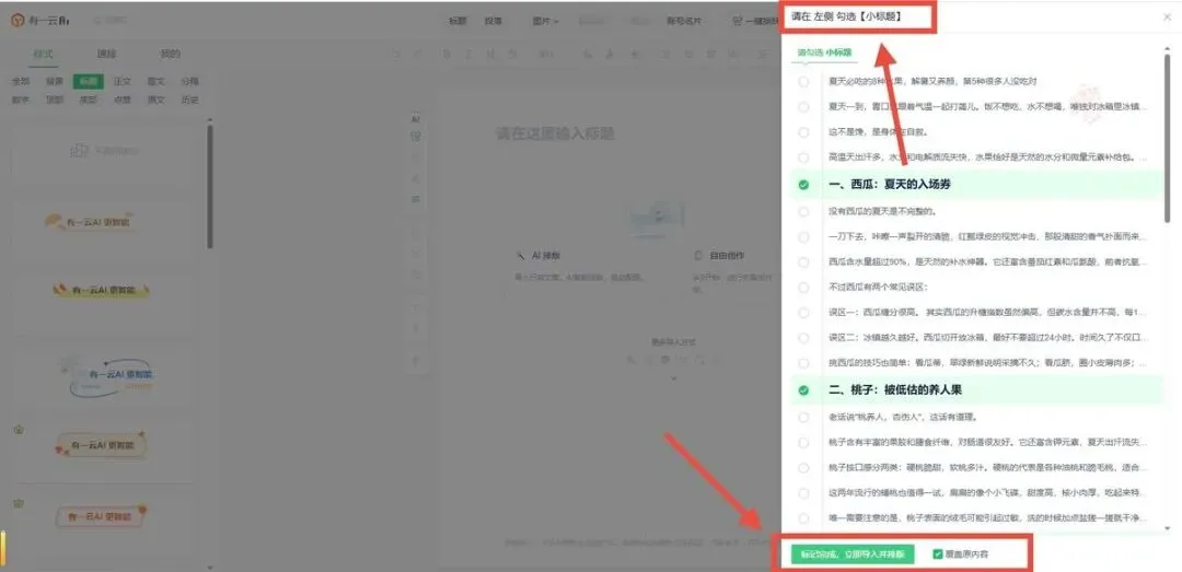 3️⃣导入的Word文件可以自选小标题,自动生成标题模板与正文区分,勾选“标记完成,立即导入并排版”自动排版。