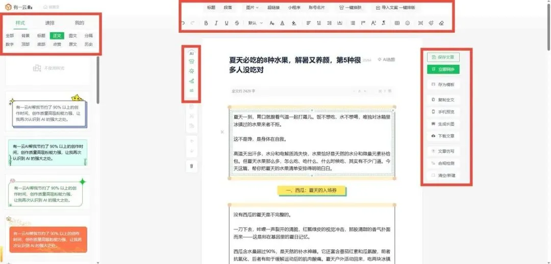 4️⃣编辑页面有多个功能区,可以进行模板的自由更换,以及页面内容的AI润色,一个编辑页就能完成所有操作,保存发布、同步多个平台。