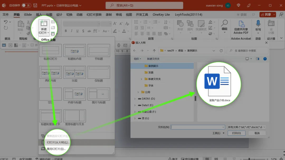 打开 PPT,新建幻灯片,点击幻灯片从大纲,选择刚才保存的 Word 文档: